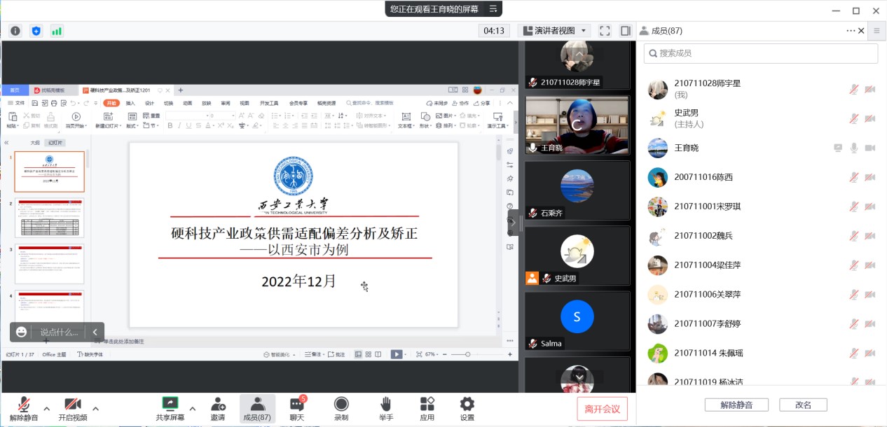 應(yīng)我校經(jīng)濟(jì)與管理學(xué)院和研究生院邀請,12月13日晚,西安工業(yè)大學(xué)經(jīng)濟(jì)管理學(xué)院王育曉教授做客我?!拔囱雽?dǎo)師論壇”,做了題為“硬科技產(chǎn)業(yè)政策供需適配偏差分析及矯正——以西安市為例”的講座,經(jīng)管學(xué)院教師及全體研究生參加報(bào)告會。
