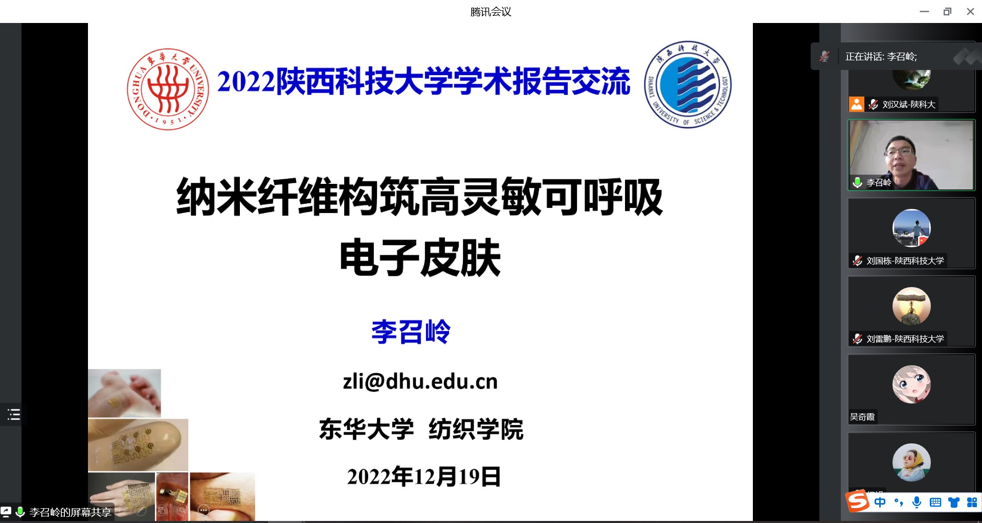 近日,應(yīng)我校輕工科學(xué)與工程學(xué)院(柔性電子學(xué)院)、科技處及前沿院邀請(qǐng),哈爾濱工業(yè)大學(xué)李垚教授、東華大學(xué)李召嶺研究員做客我?!扒把乜茖W(xué)報(bào)告”,作了題為“領(lǐng)略材料的藝術(shù)——調(diào)光控?zé)帷薄凹{米纖維構(gòu)筑高靈敏可呼吸電子皮膚”的線上學(xué)術(shù)報(bào)告。報(bào)告由輕工學(xué)院副院長劉國棟主持,學(xué)院相關(guān)專業(yè)教師、研究生及本科生參加報(bào)告會(huì)。