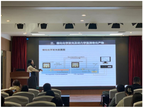 田銳副教授立足對聚合物降解過程的可視化難題,從官能團熒光可視化、自由基熒光可視化、產(chǎn)物催化化學發(fā)光等三方面介紹了團隊的最新進展,詳細闡述了催化化學發(fā)光在聚合物降解中的動力學檢測。