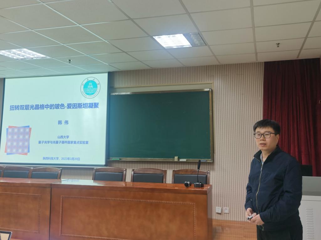3月20日下午,應(yīng)我校文理學(xué)院、科技處及前沿院邀請(qǐng),山西大學(xué)韓偉教授做客我?!扒把乜茖W(xué)報(bào)告”,作了題為“扭轉(zhuǎn)雙層光晶格中的玻色-愛(ài)因斯坦凝聚”的學(xué)術(shù)報(bào)告。報(bào)告會(huì)由文理學(xué)院院長(zhǎng)劉建科主持,文理學(xué)院物理系師生及我校相關(guān)專業(yè)師生近百人參加了此次報(bào)告會(huì)。
