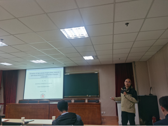 3月22日下午,應(yīng)我校文理學(xué)院、科技處及前沿院邀請(qǐng),重慶師范大學(xué)文林教授做客我校“前沿科學(xué)報(bào)告”,作了題為“自旋-張量-動(dòng)量耦合玻色-愛因斯坦凝聚體中的自旋-向列亮孤子動(dòng)力學(xué)”的學(xué)術(shù)報(bào)告。報(bào)告會(huì)由文理學(xué)院院長(zhǎng)劉建科主持,文理學(xué)院物理系師生及我校相關(guān)專業(yè)師生近百人參加了此次報(bào)告會(huì)。