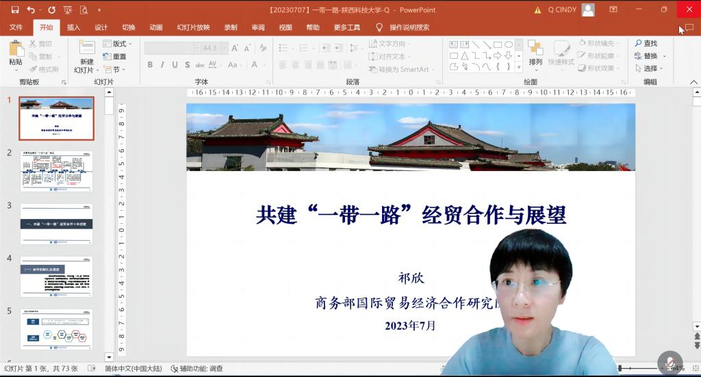 祁欣研究員首先介紹了“一帶一路”倡議提出以來,我國與沿線國家經(jīng)貿(mào)合作的發(fā)展進(jìn)程,并用豐富的案例展現(xiàn)了我國與沿線國家在“政策溝通、設(shè)施聯(lián)通、貿(mào)易暢通、資金融通、民心相通”方面取得的成就。隨后從世界經(jīng)濟(jì)困境、大國博弈、地緣政治沖突、后疫情重建等方面分析了“一帶一路”經(jīng)貿(mào)合作面臨的挑戰(zhàn),提出未來可以通過加強(qiáng)更多國家合作、拓展更廣合作領(lǐng)域、促進(jìn)更高水平合作、推動更深層次合作、發(fā)展新業(yè)態(tài)新模式、構(gòu)建更緊密合作紐帶、統(tǒng)籌發(fā)展與安全來持續(xù)推進(jìn)“一帶一路”經(jīng)貿(mào)合作。
