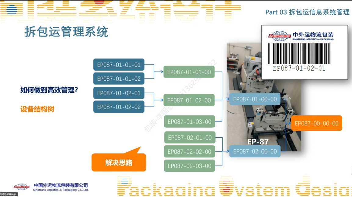 孟曉梅總經(jīng)理首先以高端制造業(yè)生產(chǎn)線、石化和鋼鐵等大型室外工廠的搬遷項目為切入點,介紹了“拆遷-包裝-運輸”一體化的概念和項目流程、拆包運的信息系統(tǒng)管理與技術(shù)融合、EGS雙碳戰(zhàn)略與物流包裝一體化等方面的內(nèi)容,并分享了團隊在拆包運一體化設(shè)計和智能包裝技術(shù)方面的創(chuàng)新成果。