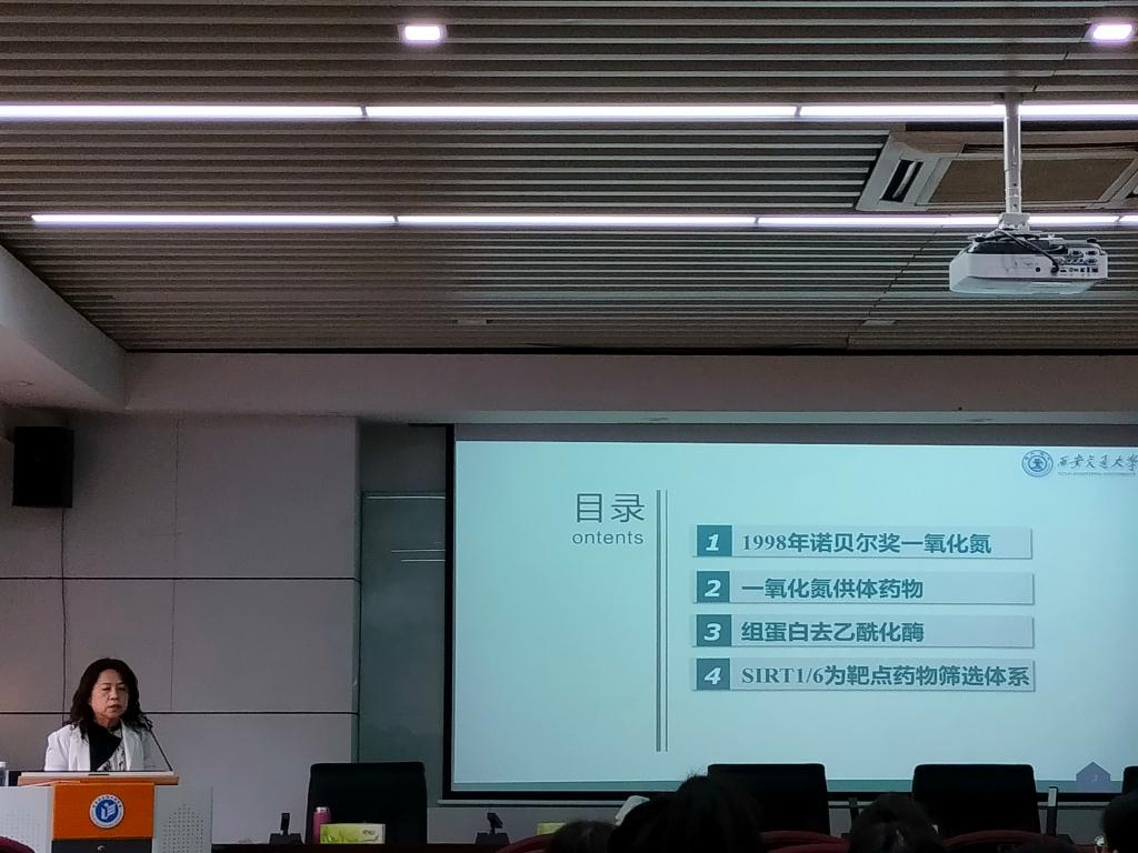 林蓉教授基于一氧化氮?jiǎng)?chuàng)新供體藥物的研究,從1998年諾貝爾獎(jiǎng)一氧化氮、一氧化氮供體藥物、組蛋白去乙?;傅确矫鏋閰?huì)師生進(jìn)行了詳細(xì)介紹。她講解了基因編輯方法及SIRIT1/6為靶點(diǎn)藥物篩選體系的原理機(jī)制,重點(diǎn)指出SIRIT1/6為靶點(diǎn)藥物篩選體系是一種備受關(guān)注的新興機(jī)制。林蓉教授在一氧化氮?jiǎng)?chuàng)新藥物的研究方面提出了指導(dǎo)性的意見(jiàn)。
