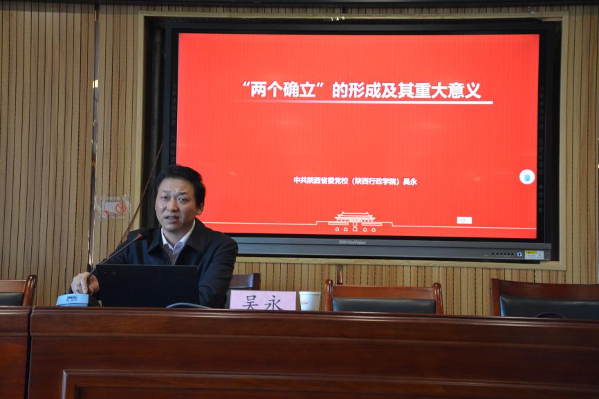 為了進(jìn)一步學(xué)習(xí)貫徹黨的二十大精神,深刻領(lǐng)會“兩個確立”的決定性意義,明確中國式現(xiàn)代化新道路的理論特點,馬克思主義學(xué)院邀請中共陜西省委黨校(陜西行政學(xué)院)副校長吳永教授于10月8日在馬院學(xué)術(shù)報告廳作了題為《“兩個確立”的形成及重大意義》的“前沿科學(xué)報告”。講座由院長吳明永主持,馬院全體師生參加了學(xué)習(xí)。