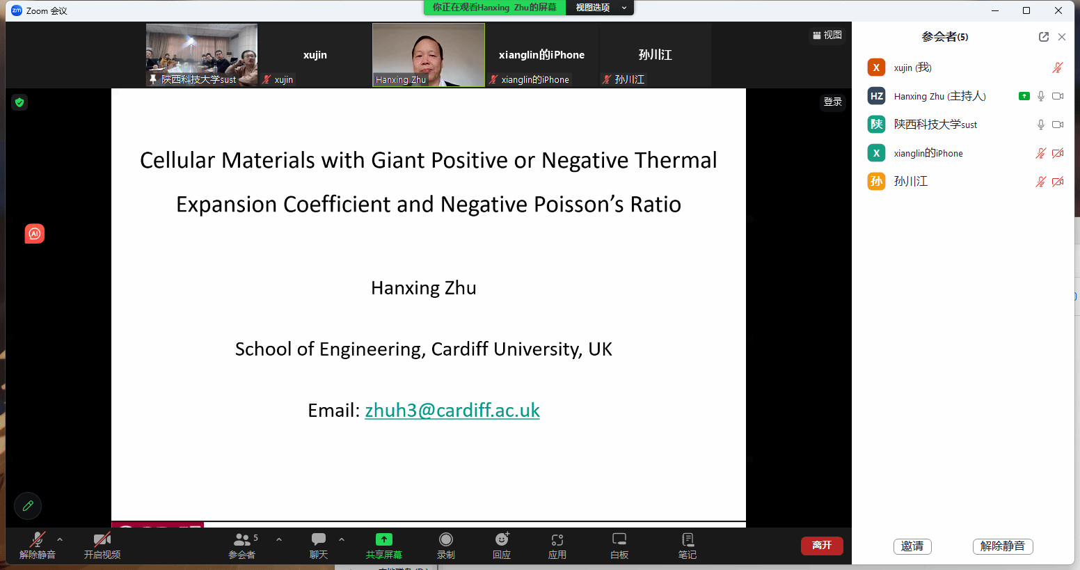 11月27日,應科技處與機電工程學院(智能制造與機器人工程學院)邀請,英國卡迪夫大學朱漢興教授做客我?!扒把乜茖W報告”,作了題為“Cellular Materials with Giant Positive or Negative Thermal Expansion Coefficient and Negative Poisson’s Ration”的學術(shù)報告。報告會由機電學院李晨教授主持,機電學院副院長楊立軍教授、微納機電研究所老師和部分研究生參加報告。