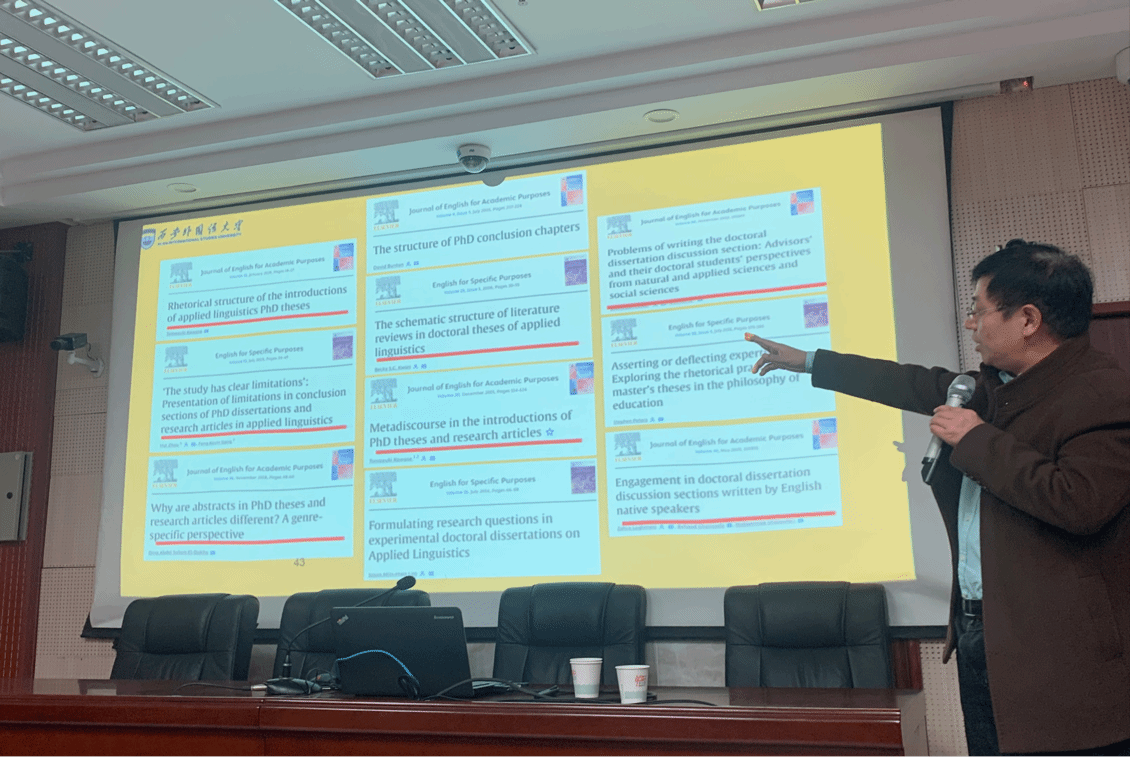12月12日下午,西安外國(guó)語(yǔ)大學(xué)副校長(zhǎng)、二級(jí)教授姜亞軍應(yīng)邀做客我?!扒把乜茖W(xué)報(bào)告”,在圖書館文化與教育學(xué)院報(bào)告廳做了題為“學(xué)術(shù)語(yǔ)篇研究與英語(yǔ)學(xué)術(shù)論文寫作”的學(xué)術(shù)報(bào)告。報(bào)告由文教學(xué)院副院長(zhǎng)李穩(wěn)敏教授主持,文教學(xué)院外語(yǔ)系教師、碩士研究生及部分本科生聆聽了此次報(bào)告。