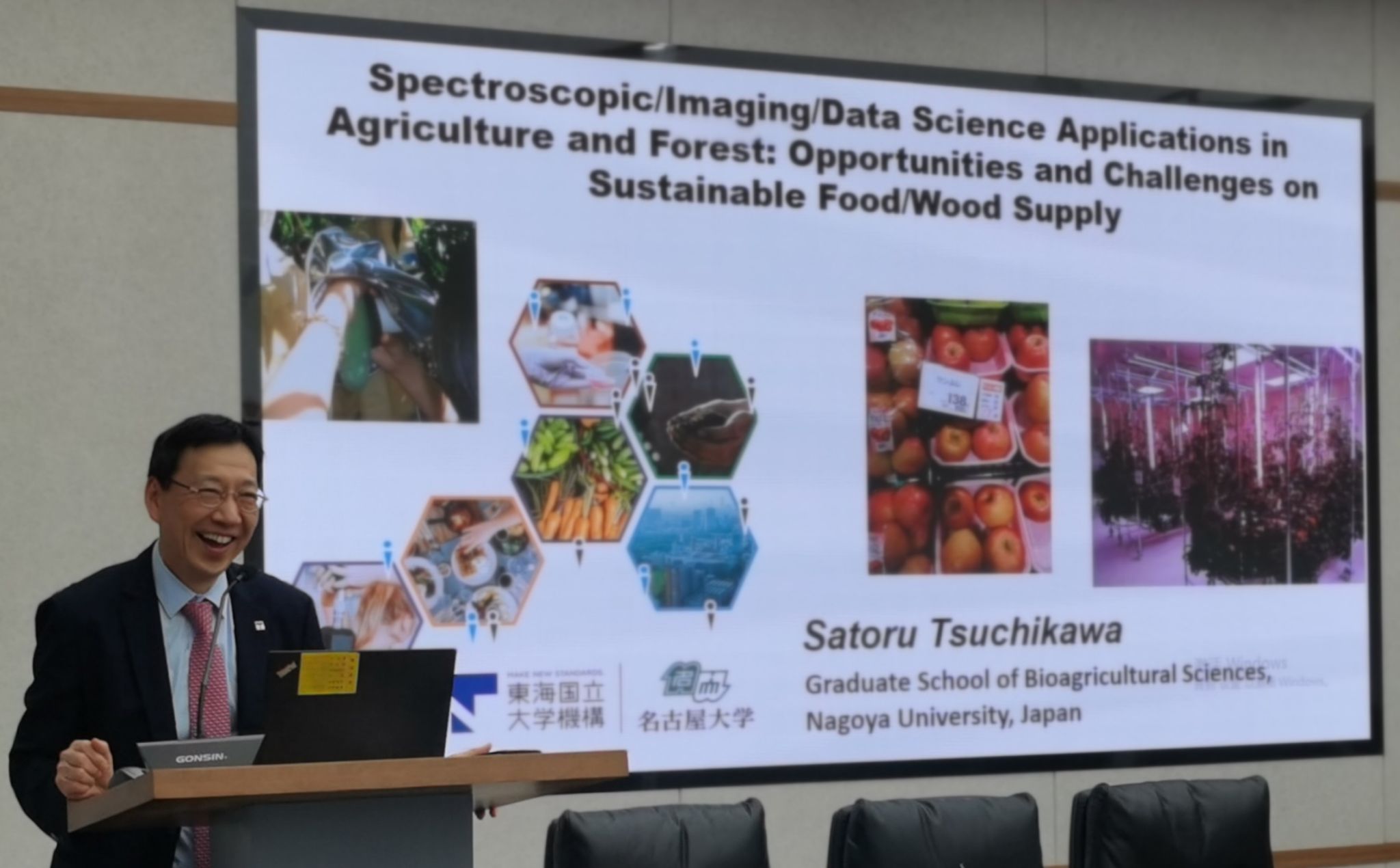 Satoru Tsuchikawa教授首先介紹了名古屋大學(xué)的歷史文化、發(fā)展現(xiàn)狀、科研進(jìn)展、專業(yè)設(shè)置等方面。接著從成像技術(shù)和深度學(xué)習(xí)在農(nóng)林方面的應(yīng)用情況、現(xiàn)代近紅外光譜(NIR)技術(shù)在果蔬、谷物和木材等品質(zhì)檢測的研究進(jìn)展、高光譜成像(HSI)技術(shù)在光譜和圖像數(shù)據(jù)融合方面的應(yīng)用案例等幾個(gè)方面介紹了領(lǐng)域內(nèi)的最新理論、方法、技術(shù)及應(yīng)用研究,并對光譜、成像和數(shù)據(jù)處理等方面的發(fā)展做出展望。最后介紹了團(tuán)隊(duì)合作和國際交流情況。