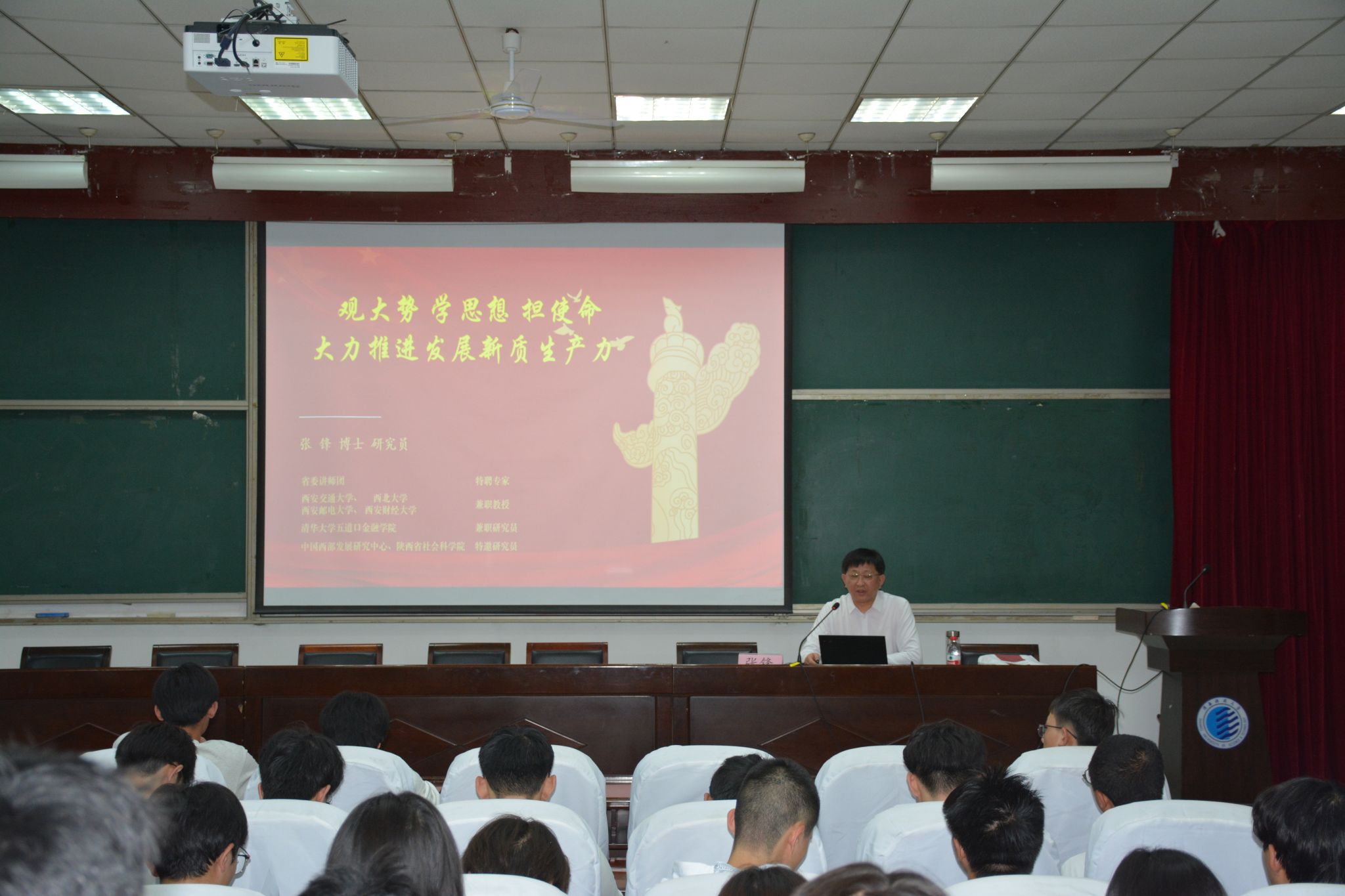 5月10日,應(yīng)我校馬克思主義學(xué)院邀請(qǐng),陜西省委理論講師團(tuán)特聘專家張鋒研究員做客“至博大講堂”,為廣大師生帶來(lái)一場(chǎng)題為“觀大勢(shì) 學(xué)思想 擔(dān)使命 大力推進(jìn)發(fā)展新質(zhì)生產(chǎn)力”的精彩報(bào)告。報(bào)告由馬院院長(zhǎng)吳明永主持,思政課教師代表、馬克思主義理論碩士研究生以及部分本科生參加報(bào)告會(huì)。