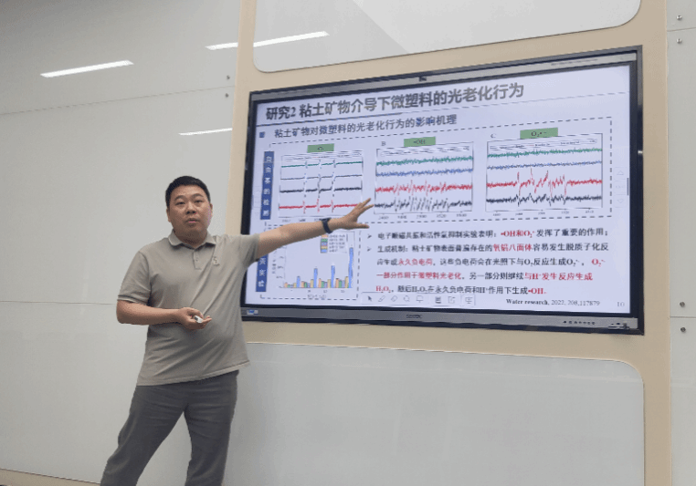 郭學(xué)濤教授介紹到土壤環(huán)境中微塑料的光老化機(jī)制尚不明確,并結(jié)合自己的研究介紹了微塑料在不同類型土壤中光老化的一系列成果,包括:通過對(duì)比光降解過程中微塑料的質(zhì)量損失、表面形貌和微觀結(jié)構(gòu)的變化發(fā)現(xiàn)光照可以誘導(dǎo)微塑料在土壤中發(fā)生老化,有機(jī)質(zhì)、粘土礦物和鐵(氫)氧化物是促進(jìn)微塑料在土壤中光老化過程的主要因素;在研究土壤礦物(粘土礦物和鐵(氫)氧化物)對(duì)微塑料老化的影響中發(fā)現(xiàn)自由基(?OH)在土壤礦物介導(dǎo)下微塑料的光降解過程中發(fā)揮了重要的作用;之后對(duì)陸源溶解性有機(jī)物的理化特性、分子組成和光化學(xué)性能進(jìn)行考察,發(fā)現(xiàn)陸源溶解性有機(jī)物的內(nèi)在屬性(類型、分子量)在微塑料老化中扮演著重要角色,明確了自由基生成、電子轉(zhuǎn)移與陸源溶解性有機(jī)物的內(nèi)在屬性之間的聯(lián)系。