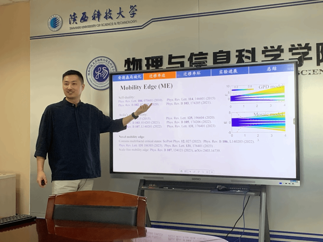 報(bào)告會(huì)上,李志副教授首先向與會(huì)師生介紹了安德森局域化的物理意義和內(nèi)涵,從而引出了固體物理中遷移率邊的概念。接下來(lái)從理論上解釋了遷移率邊出現(xiàn)的原因以及實(shí)際物理系統(tǒng)中有關(guān)遷移率邊的實(shí)驗(yàn)研究。李志副教授團(tuán)隊(duì)在傳統(tǒng)厄密系統(tǒng)的遷移率邊概念的基礎(chǔ)上,考慮非厄密物理系統(tǒng)中遷移率邊的新特性,提出了遷移率環(huán)的概念。李志副教授團(tuán)隊(duì)堅(jiān)持理論與實(shí)驗(yàn)相結(jié)合開展研究工作,他隨后向大家介紹了華南師范大學(xué)超冷原子物理團(tuán)隊(duì)驗(yàn)證理論結(jié)果所搭建的實(shí)驗(yàn)平臺(tái),以及目前的一些研究進(jìn)展。