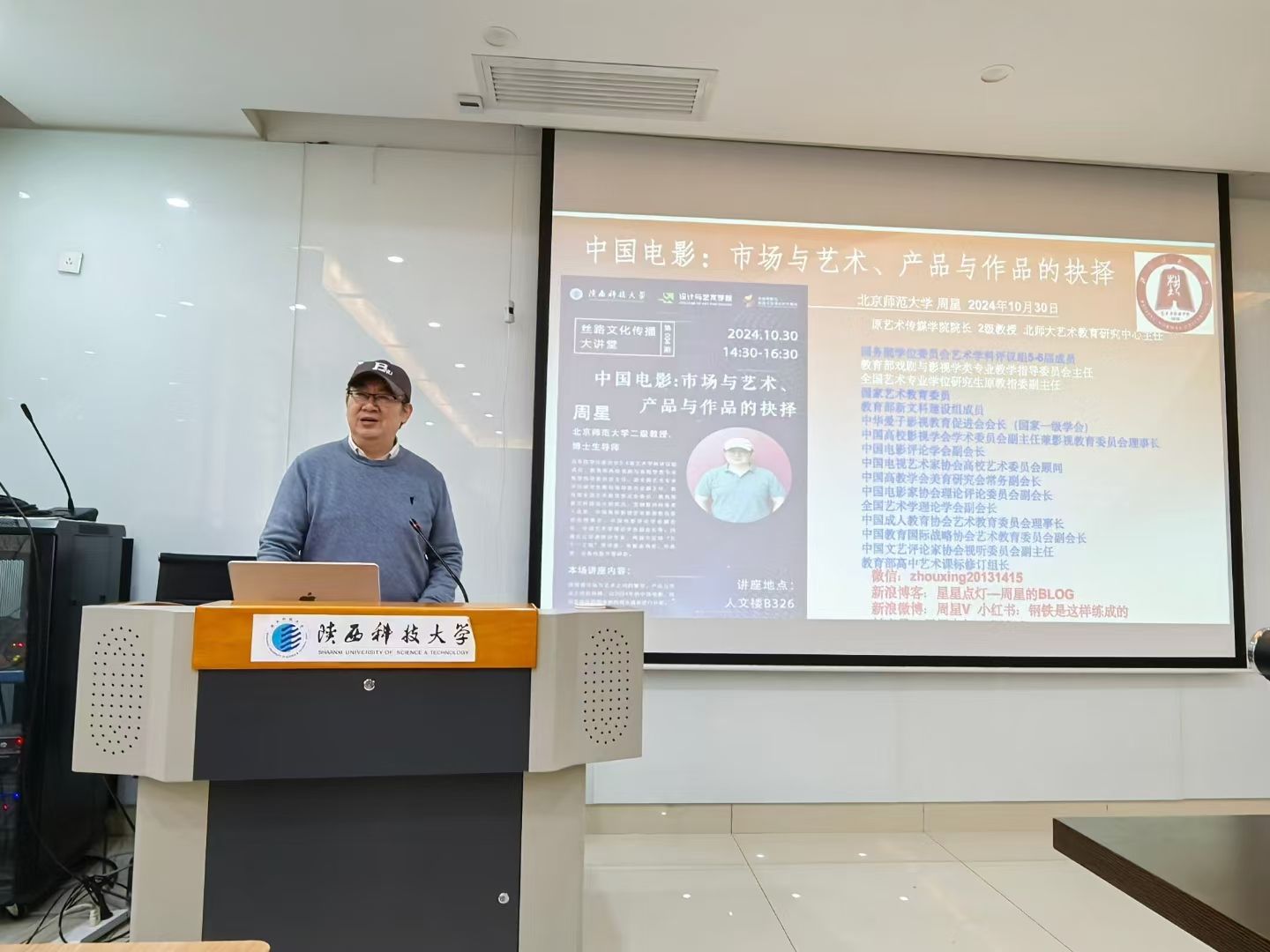 10月30日下午,應(yīng)我校設(shè)計(jì)與藝術(shù)學(xué)院、科技處及前沿院邀請,北京師范大學(xué)周星教授做客我?!扒把乜茖W(xué)報告”,作了題為“中國電影:市場與藝術(shù)、產(chǎn)品與作品的抉擇”的學(xué)術(shù)報告。報告會由設(shè)藝學(xué)院副院長吉平主持,設(shè)藝學(xué)院黨委書記劉和林及相關(guān)專業(yè)師生參加了此次報告會。