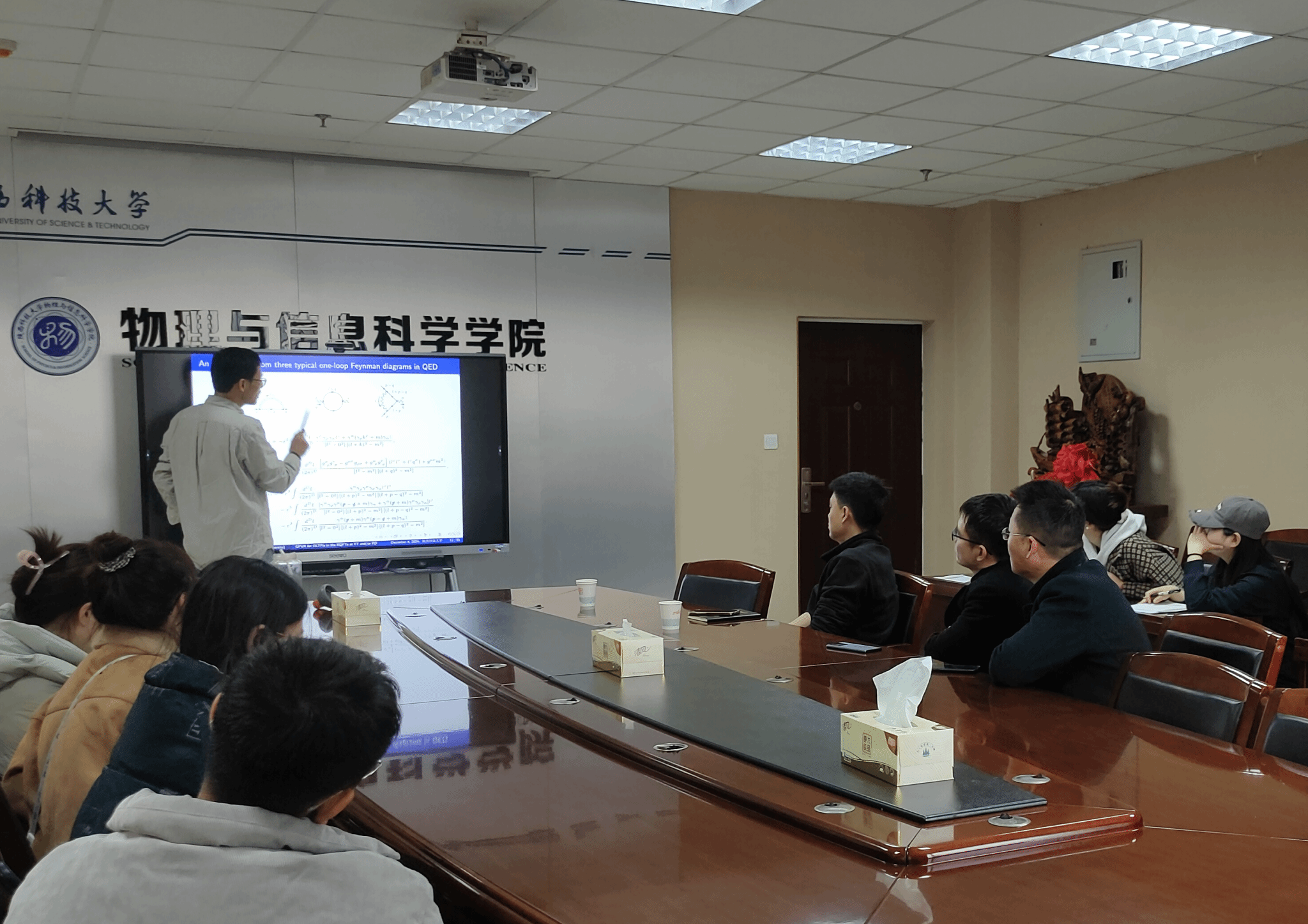 報(bào)告會(huì)結(jié)束后,與會(huì)師生與張浩然副教授就有限溫度相對(duì)論性量子場(chǎng)論中單圈費(fèi)曼圖約化方法展開(kāi)了深入的交流討論。此次報(bào)告內(nèi)容全面,營(yíng)造了良好的學(xué)術(shù)交流與討論氛圍,開(kāi)闊了我校師生的科學(xué)視野,參會(huì)師生受益匪淺。