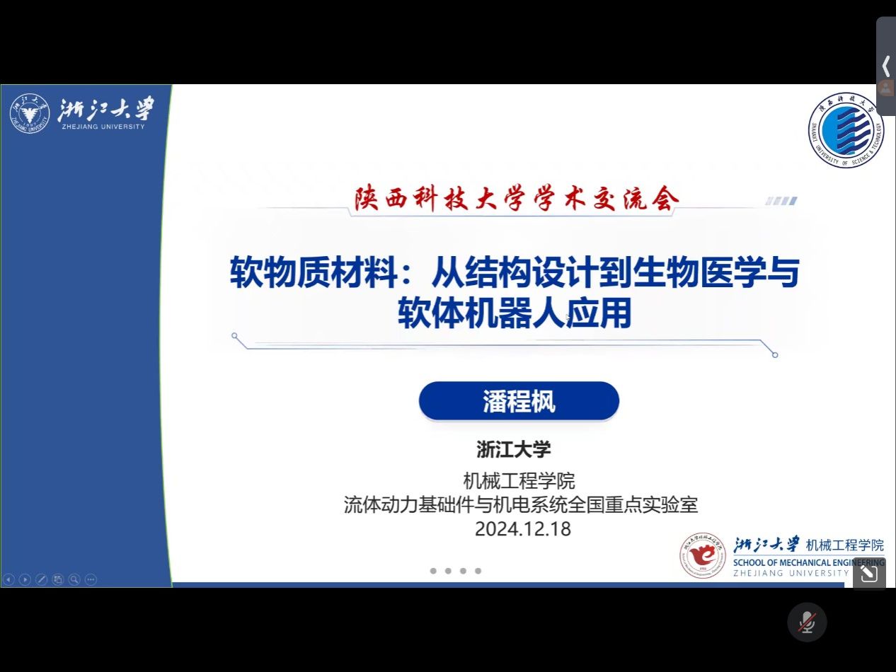 12月18日下午,應(yīng)輕工科學(xué)與工程學(xué)院(柔性電子學(xué)院)、科技處和前沿院邀請,浙江大學(xué)潘程楓研究員做客我?!扒把乜茖W(xué)報(bào)告”,作了題為 “軟物質(zhì)材料:從結(jié)構(gòu)設(shè)計(jì)到生物醫(yī)學(xué)與軟體機(jī)器人應(yīng)用”的線上學(xué)術(shù)報(bào)告。輕工學(xué)院相關(guān)師生參加了本次報(bào)告會(huì)。