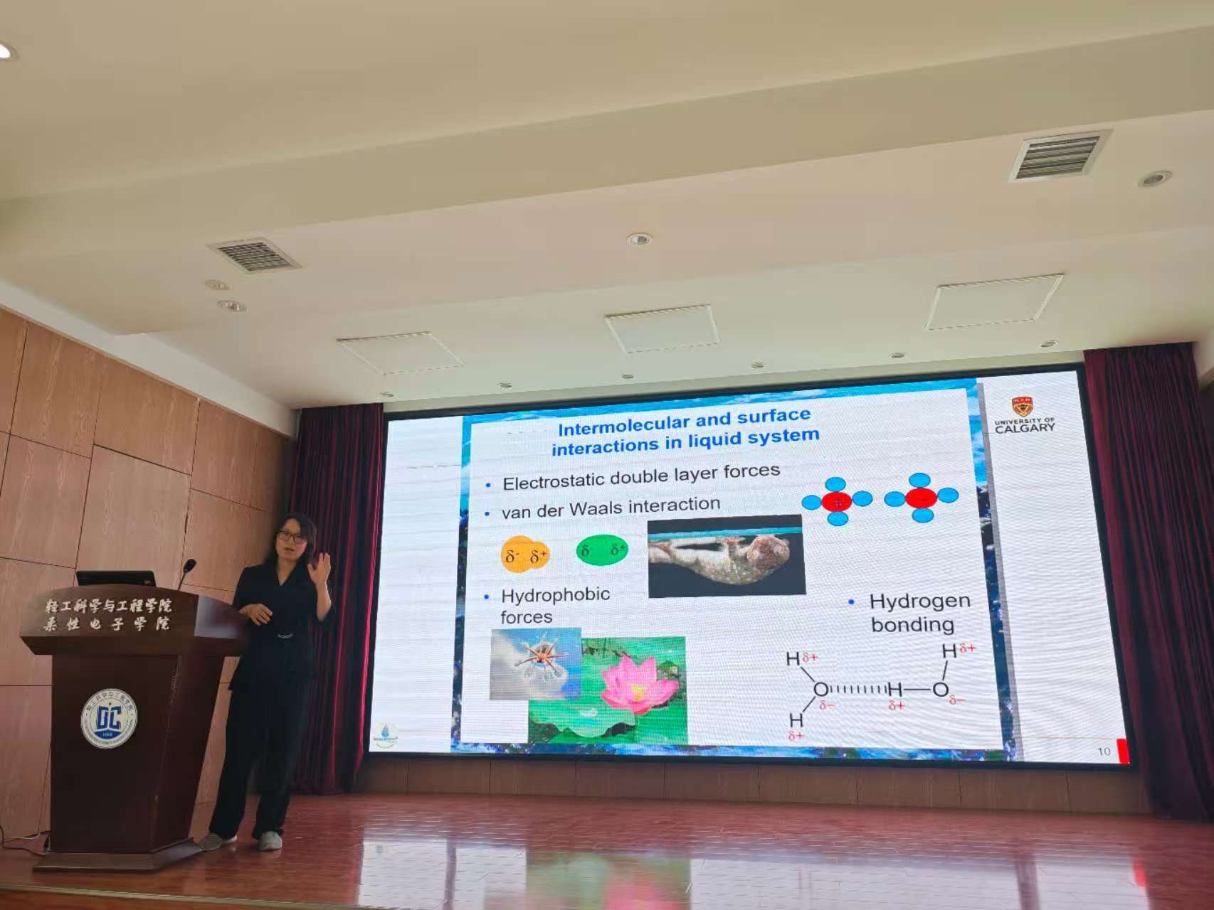呂清葉教授首先介紹了在加拿大卡爾加里大學的科研環(huán)境與實驗室建設(shè)情況,分享了國際科研工作的經(jīng)驗與感悟。隨后,重點闡述了團隊在生物聚合物復(fù)合材料方面的最新研究成果。通過引入仿生設(shè)計理念與分子間相互作用調(diào)控,研究團隊構(gòu)建了兼具功能性與可持續(xù)性的創(chuàng)新材料體系。在環(huán)境治理領(lǐng)域,基于生物混合物的多孔吸附材料展現(xiàn)出高效廢水處理、催化及抗菌等應(yīng)用潛力。在材料設(shè)計方面,團隊提出“軟硬結(jié)合”策略:柔性聚合物鏈賦予材料優(yōu)異延展性,而剛性納米粒子提供結(jié)構(gòu)支撐,從而使材料在反復(fù)彎折過程中仍能保持穩(wěn)定性能。