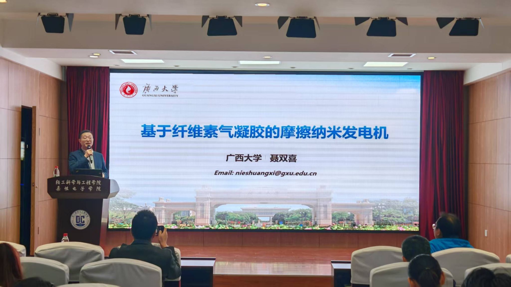 10月20日,應輕工學院(柔性電子學院)和科技處、前沿院邀請,廣西大學聶雙喜教授做客我?!扒把乜茖W報告”,做題為“基于纖維素氣凝膠的摩擦納米發(fā)電機”的學術報告,輕工學院相關教師和學生參加會議。