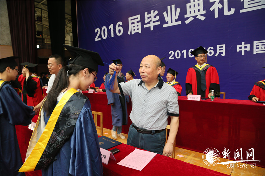 獲得博士、碩士、學(xué)士學(xué)位的畢業(yè)生代表一一登上主禮臺(tái),接受校領(lǐng)導(dǎo)撥穗并頒授學(xué)位證書(shū)。值得一提的是,這些學(xué)位證書(shū)一改往年全國(guó)統(tǒng)一的“大眾臉”,其上印制有“青出于藍(lán)勝于藍(lán)”隱喻的?;蘸汀爸琳\(chéng)至博”校訓(xùn),獨(dú)具我校特色。2016屆畢業(yè)生在收獲這一小小驚喜的同時(shí),也成為我校個(gè)性化學(xué)位證書(shū)的首批使用者。