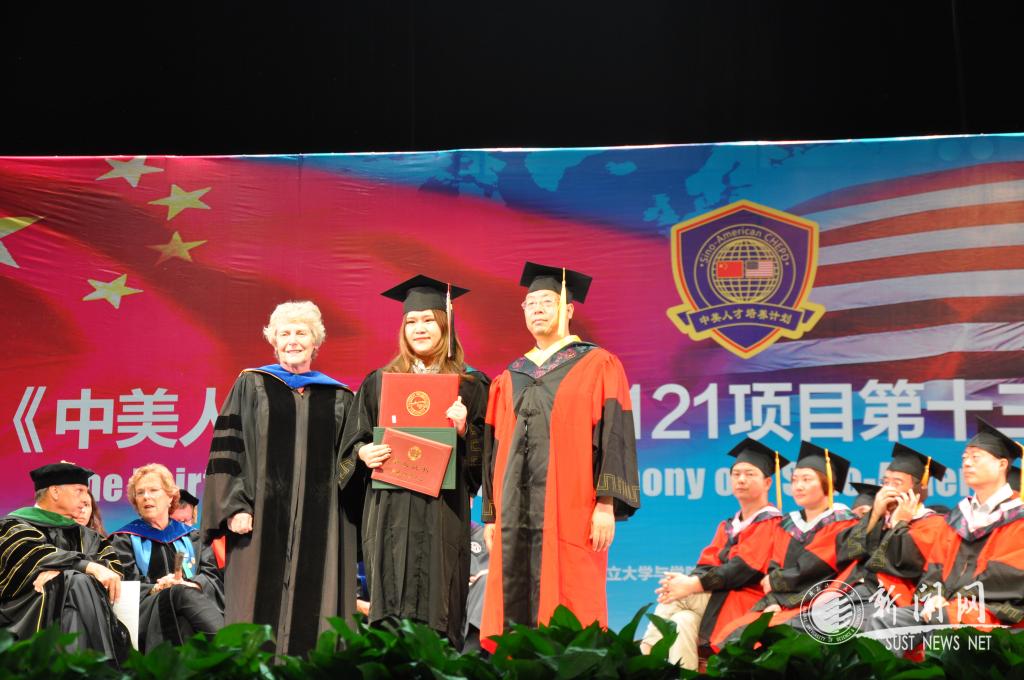 教務(wù)處處長(zhǎng)鄭恩讓在年會(huì)上與美國(guó)東華盛頓大學(xué)教務(wù)長(zhǎng)琳達(dá)·凱菲爾女士共同為我校輕工科學(xué)與工程學(xué)院包裝工程專業(yè)12級(jí)雍樂同學(xué)頒授中美雙學(xué)位畢業(yè)證和學(xué)位證書,雍樂也是我校首位121項(xiàng)目畢業(yè)生。據(jù)了解,在本屆121項(xiàng)目210多名畢業(yè)生中,雍樂同學(xué)獲評(píng)“2016年度優(yōu)秀畢業(yè)生”。