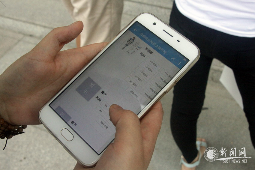 位于文體館發(fā)放軍訓(xùn)服點(diǎn),來自設(shè)計(jì)與藝術(shù)學(xué)院的新生毛蕊給記者演示了她如何在易班上預(yù)訂服裝的過程:登陸易班、選擇自助報(bào)到頁面、進(jìn)入服裝預(yù)訂系統(tǒng),即可提前網(wǎng)上選擇?!罢嬲媸欠奖阌挚旖莅。 泵镎f。