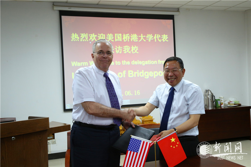為加強(qiáng)我校與美國(guó)橋港大學(xué)合作開(kāi)展科研項(xiàng)目,本科、碩士生短期交流,教師訪(fǎng)學(xué),學(xué)術(shù)交流等工作,6月16日,我校與美國(guó)橋港大學(xué)在逸夫樓舉行合作備忘錄簽約儀式,校長(zhǎng)姚書(shū)志與美國(guó)橋港大學(xué)校長(zhǎng)尼爾· 薩洛寧簽訂《合作備忘錄》。黨委副書(shū)記楊欲曉主持簽約儀式。
