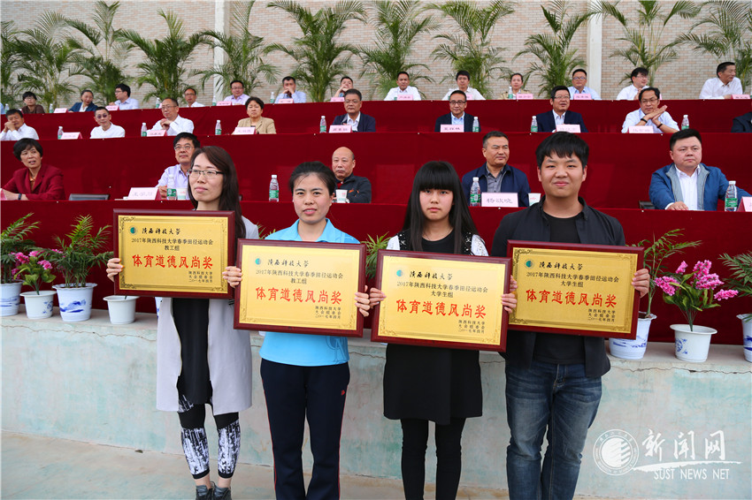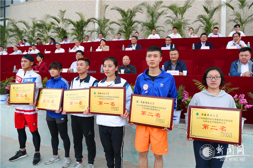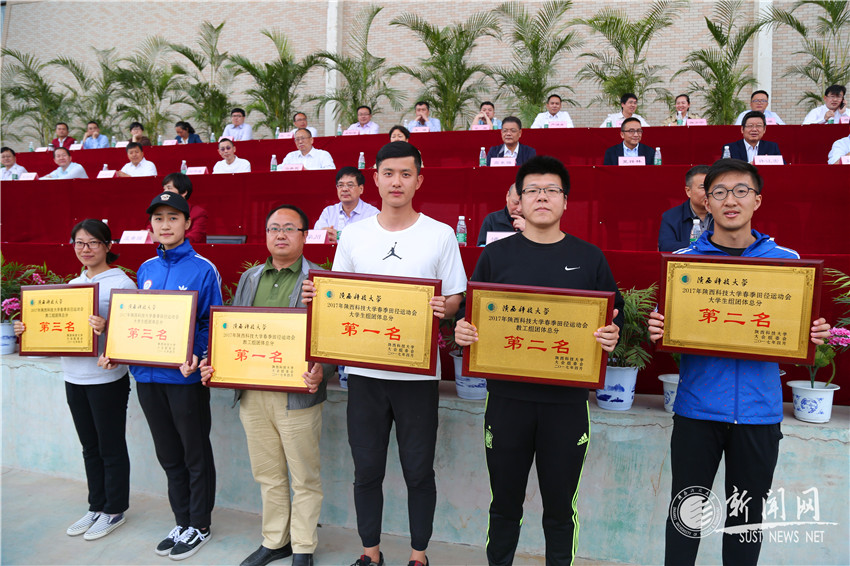 總裁判長莊希琛宣布競賽成績、獲得“體育道德風尚獎”單位名單,與會領導為獲獎單位頒獎。尤為搶眼的是,電氣與信息工程學院孫奕同學以10秒9的成績打破男子100米賽跑保持20年之久的校記錄。根據(jù)組委會公布的得分統(tǒng)計,電氣與信息工程學院分會、食品與生物工程學院分會和保障分會分別獲得教工組前三名;鎬京學院、經濟與管理學院和材料科學與工程學院分別獲得大學生組前三名;大學生女子團體前三名分別為鎬京學院、經濟與管理學院、材料科學與工程學院;大學生男子團體前三名分別為鎬京學院、材料科學與工程學院、經濟與管理學院。文理學院分會、輕工科學與工程學院分會獲得教工體育道德風尚獎,機電工程學院、電氣與信息工程學院獲得大學生體育道德風尚獎。