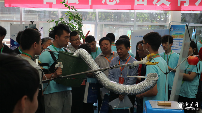 評委對我校作品“背負式蘋果輔助采摘裝置”進行現(xiàn)場問辯