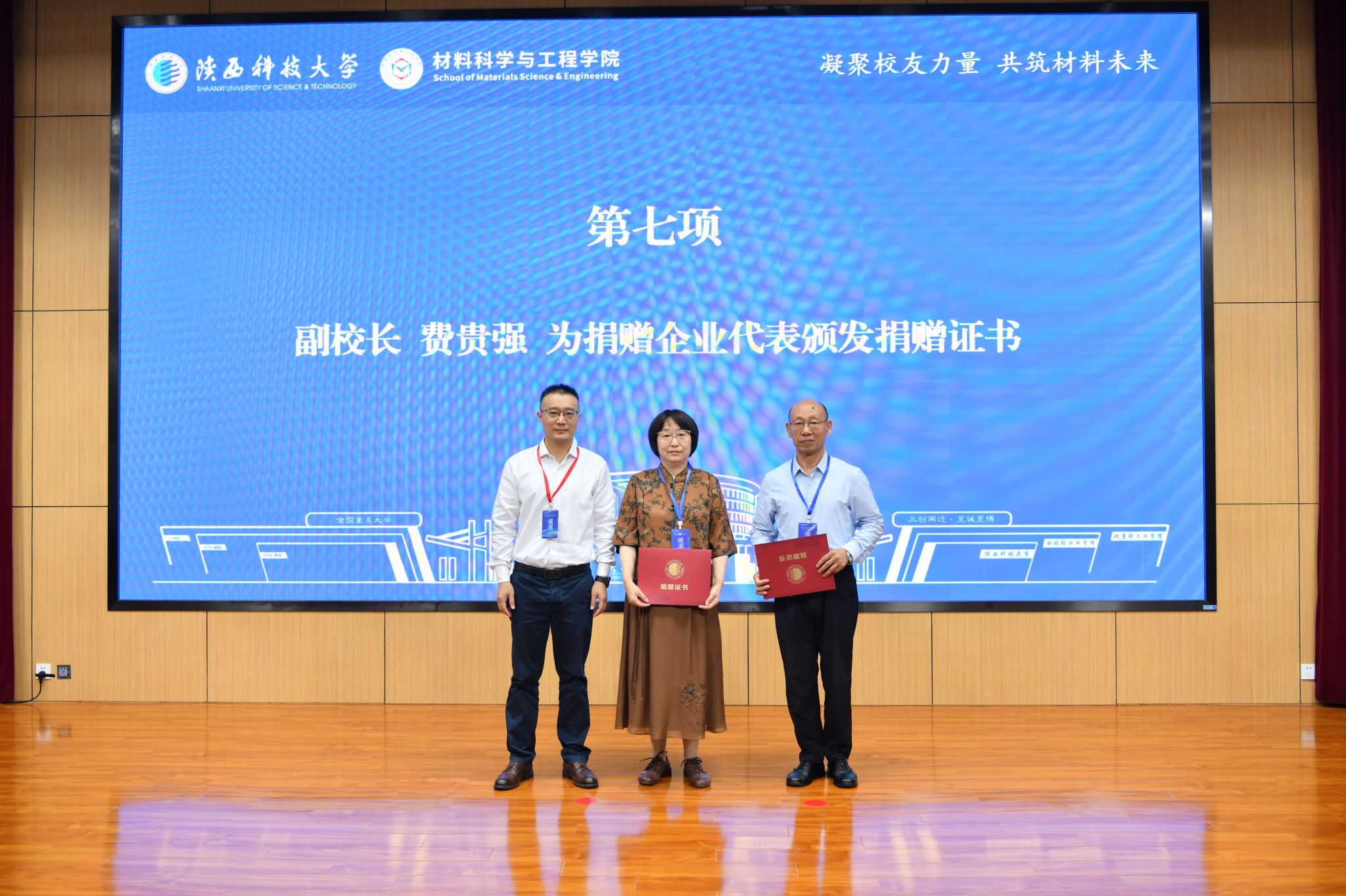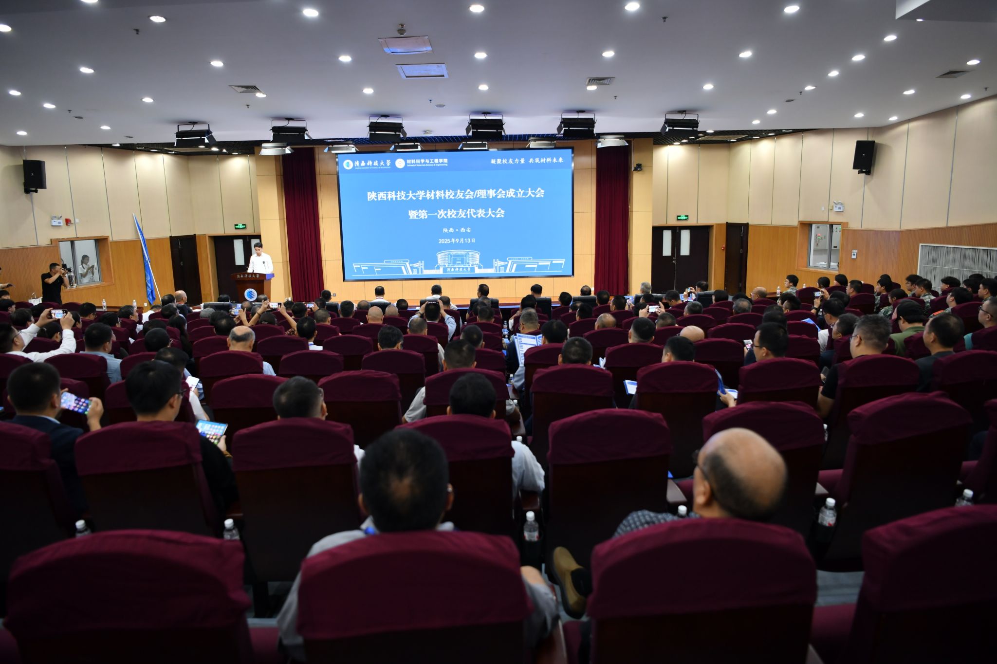 9月13日上午,陜西科技大學材料校友會/理事會成立大會暨第一次校友代表大會在學校圖書館學術報告廳舉行。黨委書記樊建武為首屆會長授會旗并頒發(fā)聘書,校長、校友總會會長黃劍鋒出席大會并講話,副校長費貴強為捐贈企業(yè)代表頒發(fā)捐贈證書。材料科學與工程學院院長楊海波主持大會。