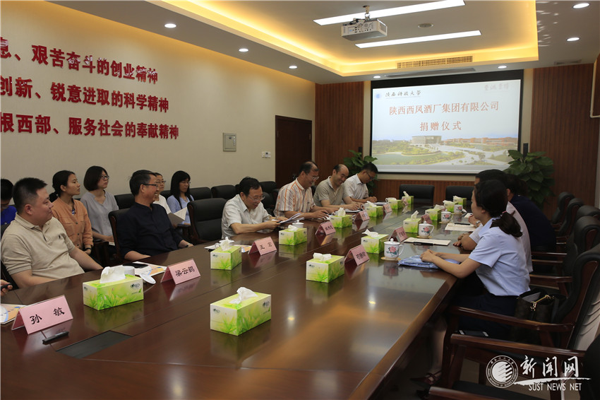 捐贈儀式在逸夫樓416室舉行。我校輕校發(fā)酵專業(yè)89屆校友、陜西西鳳酒股份有限公司總工程師王科岐,陜西科技大學(xué)中國輕工業(yè)博物館館長王宏,黨辦校辦(校友辦)主任梁云鶴,食品與生物工程學(xué)院院長陳雪峰、院黨委副書記(主持工作)訾榮祿、院長助理孫敏,食品學(xué)院在讀博士生、西鳳酒股份有限公司骨干茍靜瑜,食品學(xué)院2015屆研究生、西鳳酒股份有限公司骨干任金枚等出席儀式。