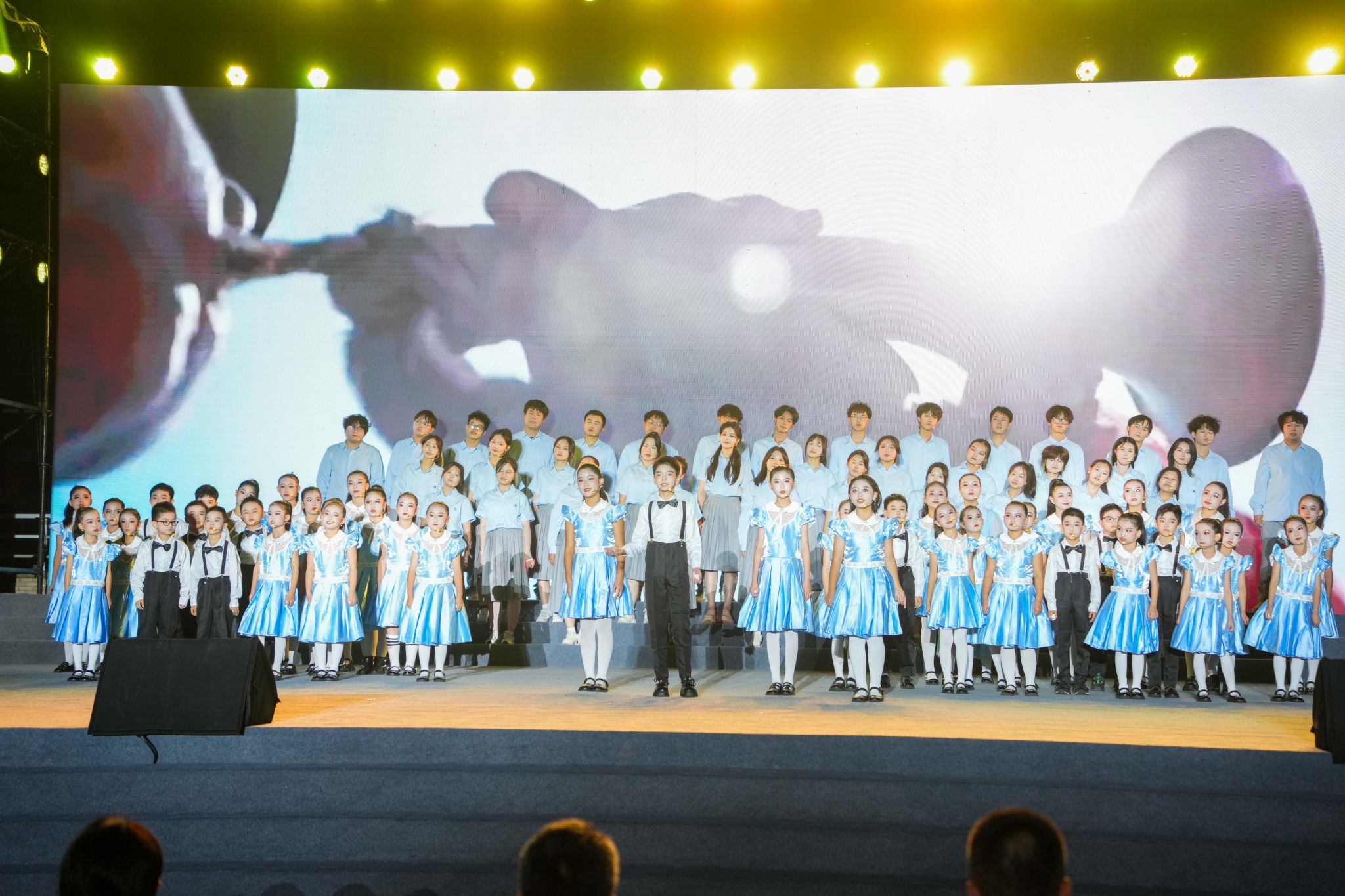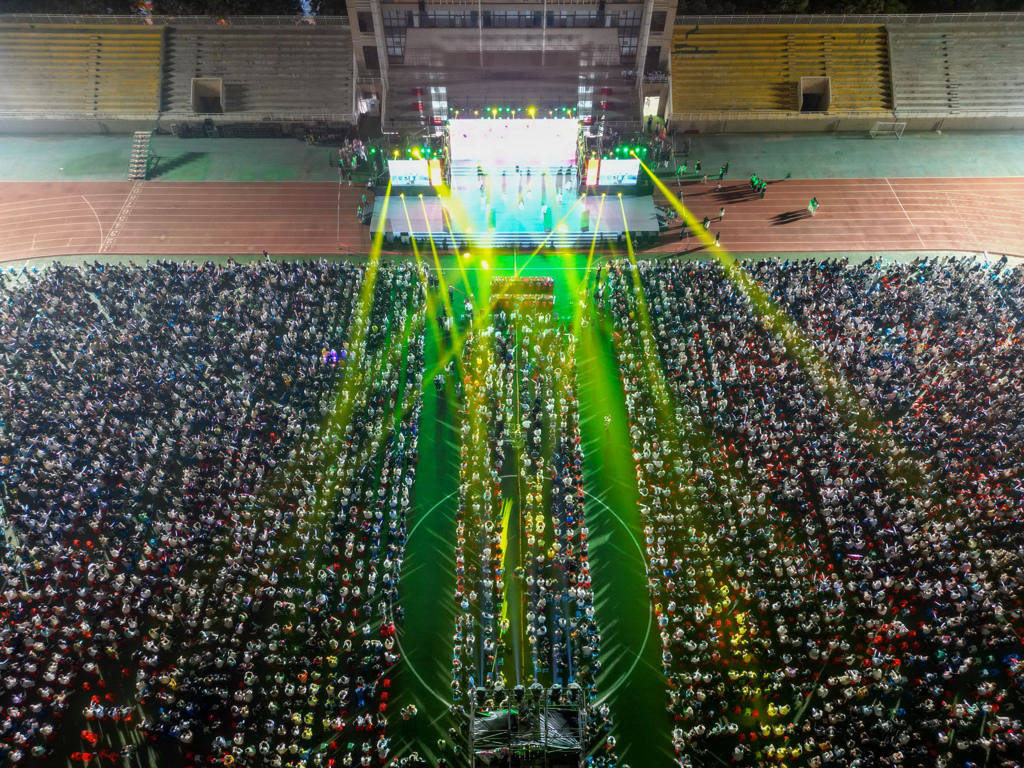 夜幕降臨時,田徑場燈火輝煌,觀眾席上熱鬧非凡,師生共同期盼這場精彩的文藝演出與生動鮮活的美育思政課。