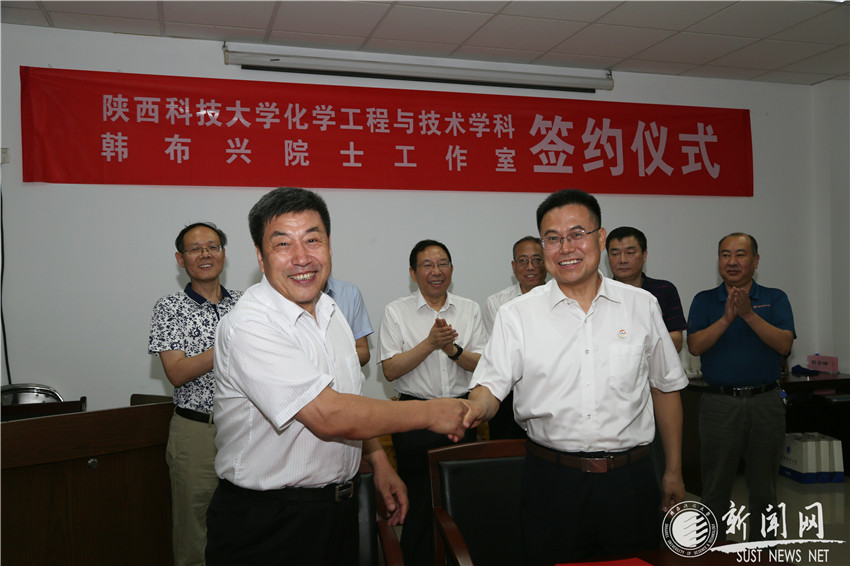 韓布興院士對(duì)在陜西科技大學(xué)設(shè)立自己的院士工作室感到十分高興和激動(dòng),感謝學(xué)校對(duì)院士工作室建設(shè)的高度重視。他對(duì)學(xué)校近年來(lái)各項(xiàng)事業(yè)的迅速發(fā)展和綜合實(shí)力的不斷提升給予了高度評(píng)價(jià)。他表示,院士工作室的設(shè)立既是一份責(zé)任,也是一種壓力,有利于雙方優(yōu)勢(shì)互補(bǔ),實(shí)現(xiàn)共同目標(biāo)。他從今天起就成為陜西科技大學(xué)大家庭中的一員,非常愿意為推動(dòng)學(xué)校學(xué)科發(fā)展出力。化學(xué)化工與綠色化學(xué)與技術(shù)的結(jié)合發(fā)展是當(dāng)前非常重要的研究領(lǐng)域,院士工作室將瞄準(zhǔn)學(xué)科前沿,進(jìn)一步凝練研究方向,為努力提升化學(xué)學(xué)科的特色優(yōu)勢(shì)做出力所能及的貢獻(xiàn),使學(xué)校在相關(guān)學(xué)科領(lǐng)域走在全國(guó)前列。