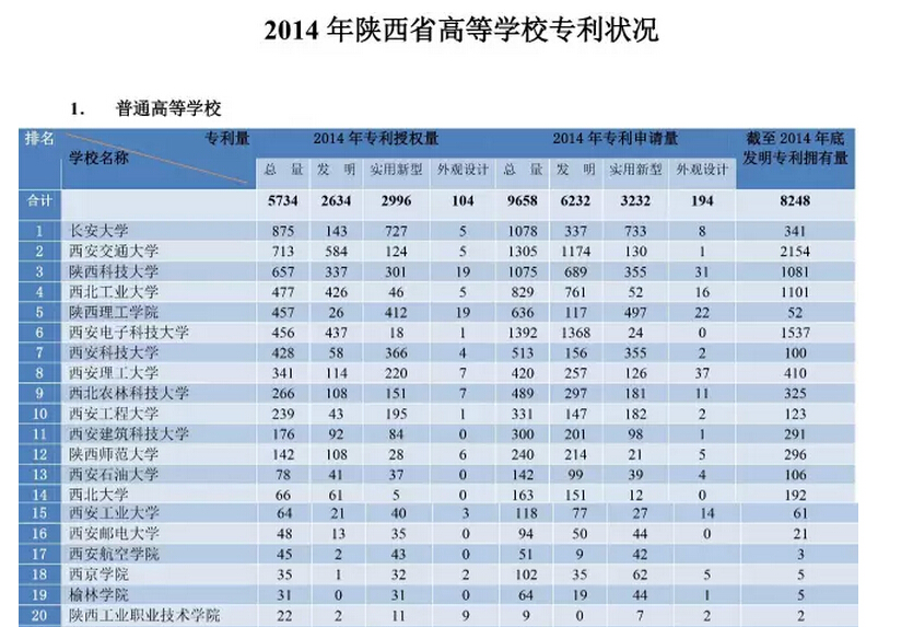據(jù)統(tǒng)計(jì)數(shù)據(jù)顯示,2014年,陜西省組織專利活動的高校共51所,占全省高??倲?shù)的44%;共申請專利10315件,占全省專利申請總量的18.3%;共獲授權(quán)專利6137件,占全省專利授權(quán)總量的26.9%。截至2014年底,全省高校共有有效發(fā)明專利8620件,占全省有效發(fā)明專利的49%。其中,普通高校有專利活動的共41家,2014年專利授權(quán)排名前十的高校分別是長安大學(xué)、西安交通大學(xué)、陜西科技大學(xué)、西北工業(yè)大學(xué)、陜西理工學(xué)院、西安電子科技大學(xué)、西安科技大學(xué)、西安理工大學(xué)、西北農(nóng)林科技大學(xué)和西安工程大學(xué);獨(dú)立學(xué)院有專利活動的共3家,分別是西安交通大學(xué)城市學(xué)院、西安建筑科技大學(xué)華清學(xué)院和西北工業(yè)大學(xué)明德學(xué)院;成人高校有專利活動的1家,為陜西廣播電視大學(xué)。