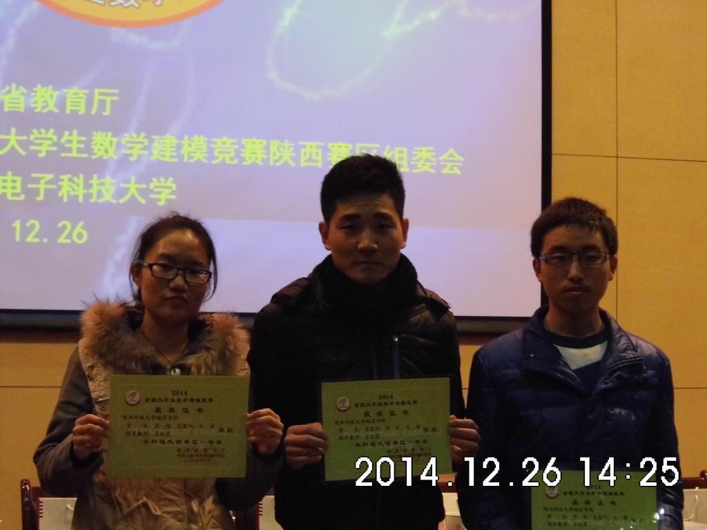 2014年學(xué)院首次組織學(xué)生參加全國大學(xué)生數(shù)學(xué)建模競賽和數(shù)學(xué)競賽,隊(duì)員主要從高數(shù)基地班中選拔,共12名學(xué)生組成4支隊(duì)伍參加建模競賽,239名同學(xué)參加數(shù)學(xué)競賽,并統(tǒng)籌聘請陜西科技大學(xué)的優(yōu)秀建模教練組和學(xué)院的優(yōu)秀青年教師對參賽學(xué)生進(jìn)行暑期集中培訓(xùn)、輔導(dǎo)及后期強(qiáng)化訓(xùn)練。歷經(jīng)1個(gè)多月緊張學(xué)習(xí),同學(xué)們同心協(xié)力、團(tuán)結(jié)拼搏、不畏困難,最終取得了優(yōu)異的成績,為學(xué)院贏得了榮譽(yù)。