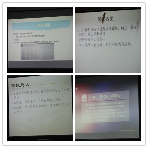 “一對(duì)一結(jié)對(duì)幫扶”活動(dòng)第二階段中期檢查答辯會(huì)于五月尾召開(kāi)。學(xué)院全體學(xué)生黨員就近期結(jié)對(duì)幫扶進(jìn)展情況以PPT的形式進(jìn)行答辯,答辯人員從幫扶內(nèi)容、幫扶效果、幫扶意義三個(gè)方面進(jìn)行闡述,著重體現(xiàn)幫扶效果。經(jīng)過(guò)兩個(gè)多月的幫扶工作,“一對(duì)一結(jié)對(duì)幫扶”活動(dòng)已初見(jiàn)成效。有的幫扶對(duì)象在黨員的幫扶下,圍繞英語(yǔ)四六級(jí)制定了適合自己的學(xué)習(xí)方案,針對(duì)薄弱環(huán)節(jié)進(jìn)行專項(xiàng)訓(xùn)練,努力提升英語(yǔ)綜合水平以備戰(zhàn)即將到來(lái)的等級(jí)考試;有的幫扶對(duì)象在黨員的學(xué)業(yè)指導(dǎo)下,一改過(guò)去自由散漫的生活狀態(tài),學(xué)習(xí)成績(jī)有了很大的提高,在補(bǔ)考中取得了好成績(jī),畢業(yè)生的畢業(yè)設(shè)計(jì)也能夠較好的跟上進(jìn)度;論文及專利的撰寫(xiě)是研究生具備一定科研能力的體現(xiàn),通過(guò)結(jié)對(duì)幫扶,幫扶對(duì)象在論文發(fā)表及專利申請(qǐng)上均有成果展現(xiàn),個(gè)人科研能力也得到了提升。機(jī)電學(xué)院2013級(jí)學(xué)生黨支部黨員任曉明說(shuō): “我只是在用我自身的能力去幫助周?chē)耐瑢W(xué),希望自己的這種能量能夠傳遞給更多的人,如果能夠起到作用,幫助他人的同時(shí)自身價(jià)值也得到了體現(xiàn),這讓我覺(jué)得很有意義?!睅头鰧?duì)象唐鋼說(shuō):“我在黨員的幫扶下,一直督促自身改掉以前的懶惰習(xí)慣,今年的補(bǔ)考全部通過(guò),現(xiàn)在感覺(jué)又有信心啦?!?/p>