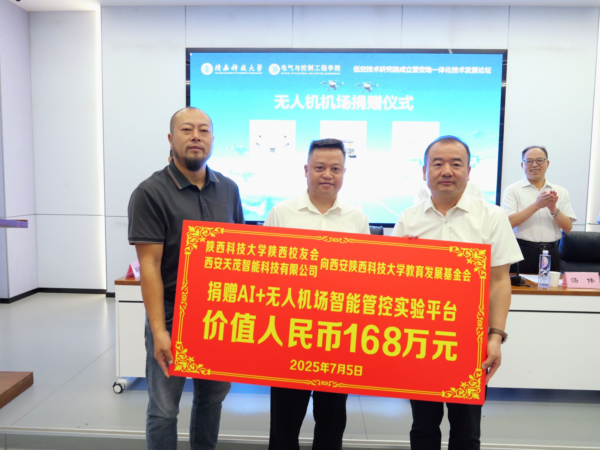 校友企業(yè)西安天茂智能科技有限公司聯(lián)合陜西科技大學(xué)教育發(fā)展基金會舉行了空地一體化設(shè)備捐贈儀式,將價(jià)值168萬元的無人機(jī)場智能管控實(shí)驗(yàn)平臺贈與母校。西安天茂智能科技有限公司總經(jīng)理李冬武、陜西科技大學(xué)校友總會秘書長殷立雄、陜科大陜西校友會秘書長唐秸,共同完成簽署捐贈協(xié)議、捐贈設(shè)備和頒發(fā)捐贈證書。