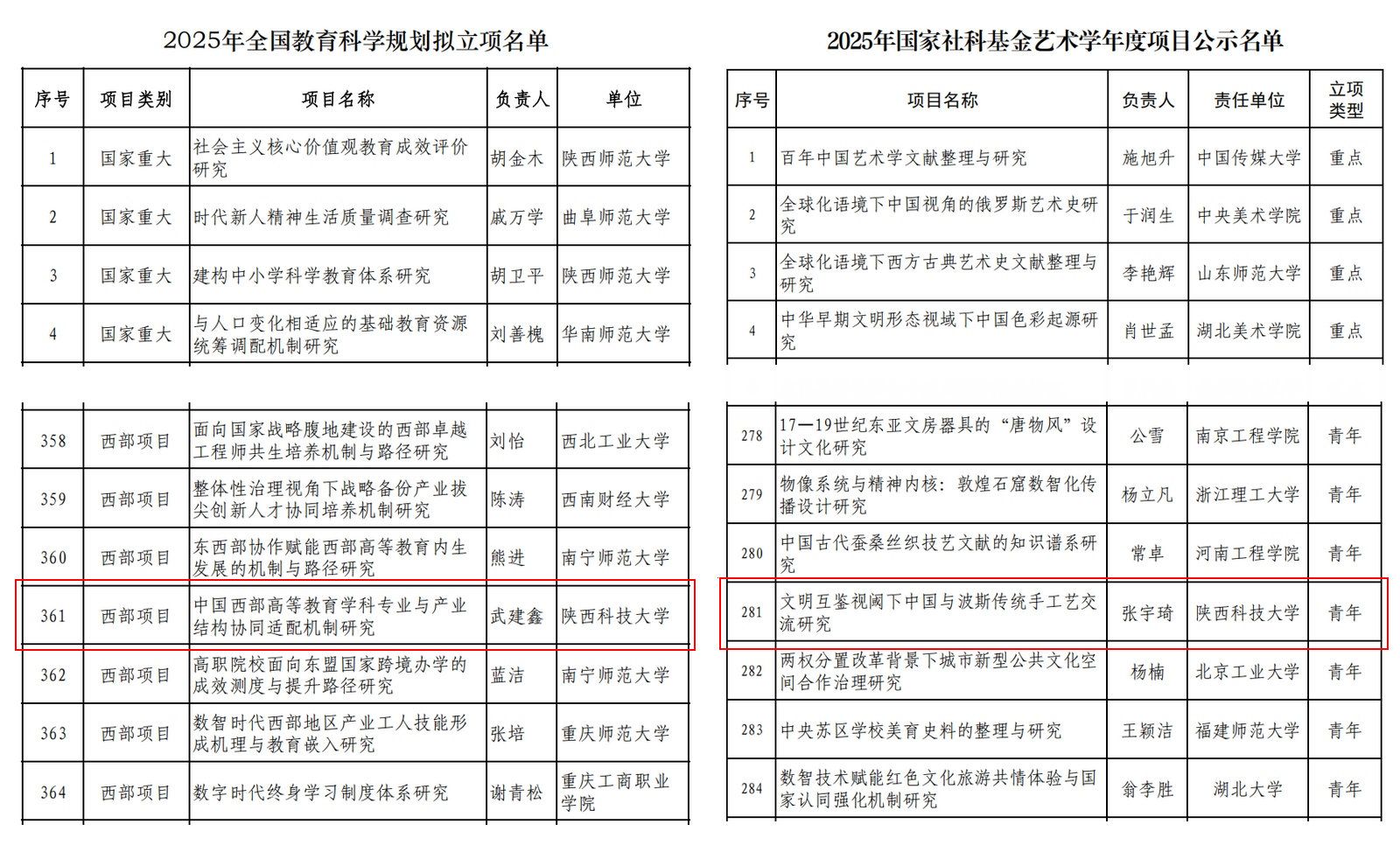 人文社科領(lǐng)域多點突破,高層次項目取得新進展。在人文社科領(lǐng)域,學(xué)校重點推進國家級、省級項目申報與成果培育。其中,張宇琦博士的《文明互鑒視閾下中國與波斯傳統(tǒng)手工藝交流研究》獲批國家社科基金藝術(shù)學(xué)年度項目公示;武建鑫教授在2025年國家社科基金(教育學(xué))評審中成功立項,成為陜西省屬高校僅有的3項立項之一。此外,學(xué)校組織24項成果申報陜西省第十七次哲學(xué)社會科學(xué)優(yōu)秀成果獎,推薦6位專家參選習(xí)近平文化思想研究中心陜西協(xié)同研究基地專家?guī)?,并完?5項陜西省文化和旅游課題申報,人文社科影響力持續(xù)提升。