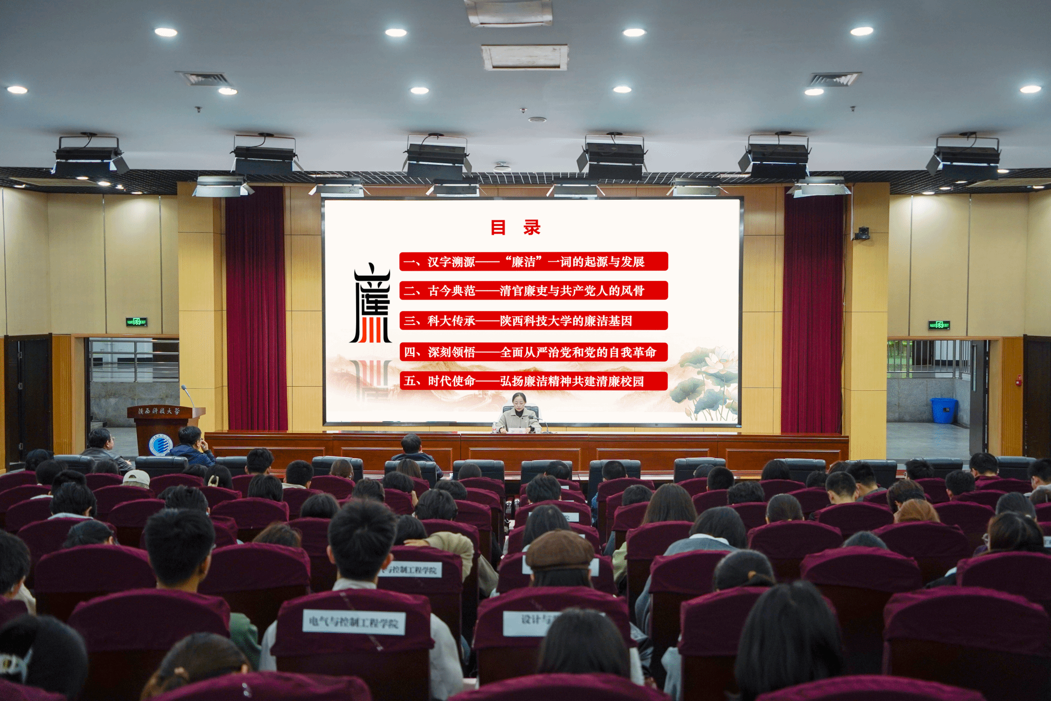 羅瑩從“‘廉潔’一詞的典籍溯源、歷史上的清官廉吏與共產(chǎn)黨人的風(fēng)骨、陜西科技大學(xué)的廉潔基因、深刻理解全面從嚴(yán)治黨和黨的自我革命、弘揚廉潔精神共建清廉校園”五個方面展開授課。她指出,廉潔是中華民族的傳統(tǒng)美德。在陜西科技大學(xué)校史上,以朱康、潘津生、曹光銳、游恩溥等為代表的老一輩教育工作者艱苦奮斗、無私奉獻(xiàn)、清廉自守,用畢生心血續(xù)寫了“廉潔”二字在陜科大的時代篇章,青年學(xué)子要從他們的事跡中汲取精神滋養(yǎng),涵養(yǎng)道德修為,積極傳播廉潔理念、弘揚廉潔文化,做廉潔精神的堅定倡導(dǎo)者和踐行者。她指出,黨通過自我革命為青年成長成才創(chuàng)造了更公平的競爭環(huán)境、更清晰的價值標(biāo)桿、更可信的未來圖景,同學(xué)們要深刻理解并自覺擁護(hù)黨的路線方針政策,在創(chuàng)建廉潔社會的“大環(huán)境”下,守護(hù)校園清風(fēng)正氣。她結(jié)合校園內(nèi)可能存在的學(xué)術(shù)不端、求職造假、助學(xué)貸款失信、學(xué)生干部“微腐敗”等風(fēng)險案例進(jìn)行警示教育,并向全體新生提出五點要求:在學(xué)術(shù)求知上堅守“誠信”底線,在人際交往上崇尚“簡單”法則,在集體事務(wù)上恪守“公正”原則,在個人消費上養(yǎng)成“節(jié)制”習(xí)慣,在網(wǎng)絡(luò)空間里強(qiáng)化“紅線”意識。她勉勵全體新生牢記“至誠至博”的校訓(xùn),傳承“三創(chuàng)兩遷”的大學(xué)精神,以古今先賢和身邊的“大先生”為榜樣,樹廉潔之心、做廉潔之人、行廉潔之事,扣好人生“第一??圩印?,用清正廉潔護(hù)航人生之路行穩(wěn)致遠(yuǎn),努力成長為堪當(dāng)民族復(fù)興重任的時代新人。