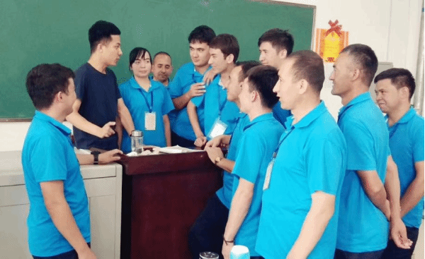石海旺(左一)向少數(shù)民族同事請教學(xué)習(xí)維吾爾語