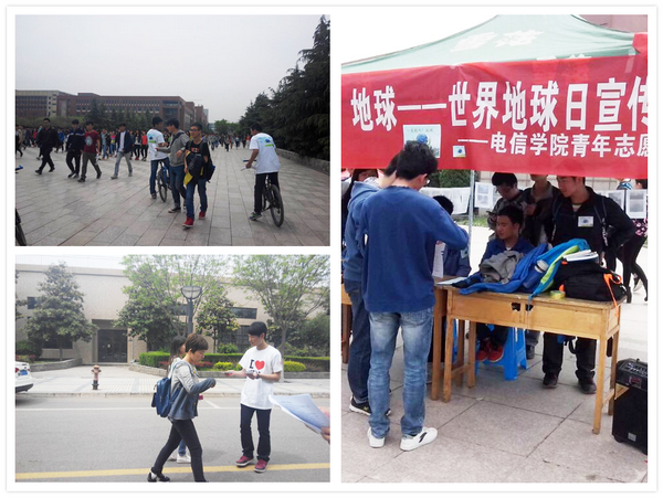 2015年4月22日是第46個(gè)“世界地球日”,本年度的活動(dòng)主題是“珍惜地球資源,轉(zhuǎn)變發(fā)展方式——提高資源利用效益”。當(dāng)天,電氣與信息工程學(xué)院青年志愿者服務(wù)團(tuán)在沁園廣場(chǎng)開(kāi)展了以“奔跑吧,地球”為主題的宣傳活動(dòng),號(hào)召同學(xué)們用自己的實(shí)際行動(dòng)珍惜和保護(hù)我們的地球。