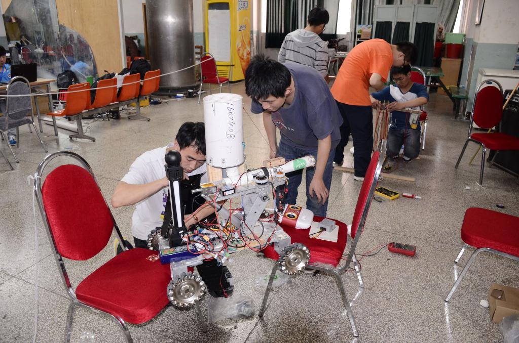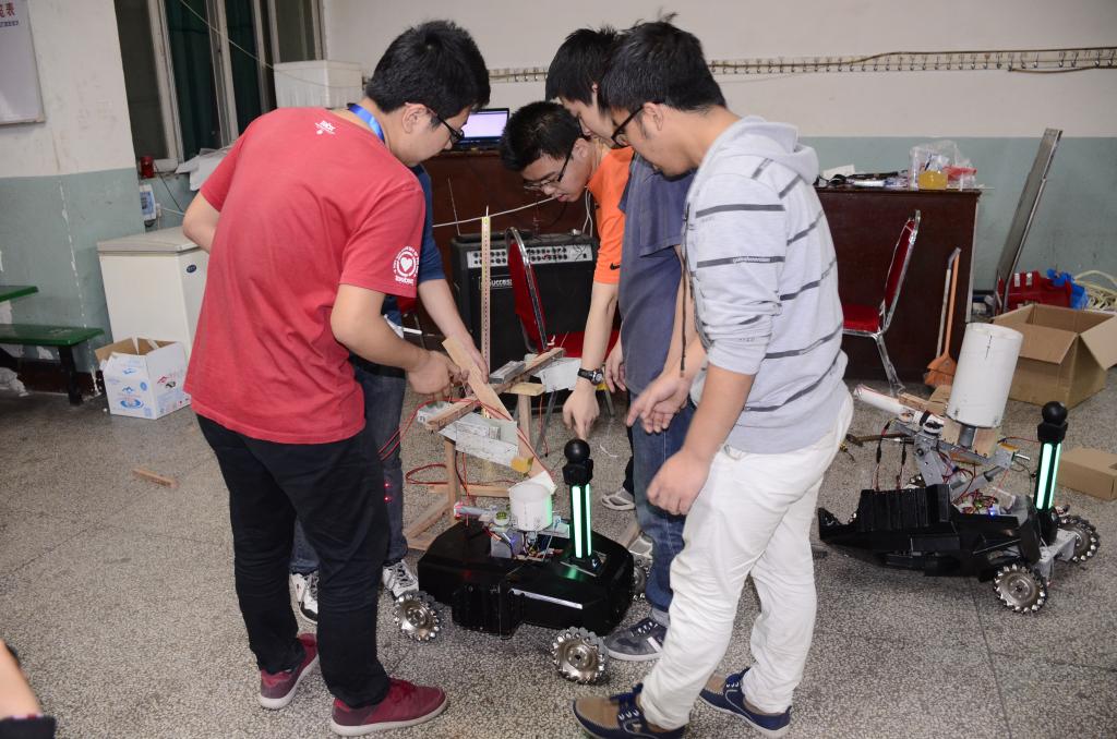 我校從2014年12月起開始大賽備戰(zhàn),由校團委牽頭組織,并配備了專門的試驗場地和活動資金,電氣與信息工程學(xué)院組織遴選,確定周強、郭文強、蔡陳赟3位指導(dǎo)老師帶領(lǐng)徐啟超、董晨宇等12名學(xué)生組成的“科大戰(zhàn)警隊”作為我校代表隊參賽。他們經(jīng)過緊張艱苦的籌備和反復(fù)試驗,設(shè)計制作的機器人戰(zhàn)隊順利通過了大賽2015年3月至5月期間進行的三輪專家考核和篩選,最終成功殺入西北賽區(qū)決賽。