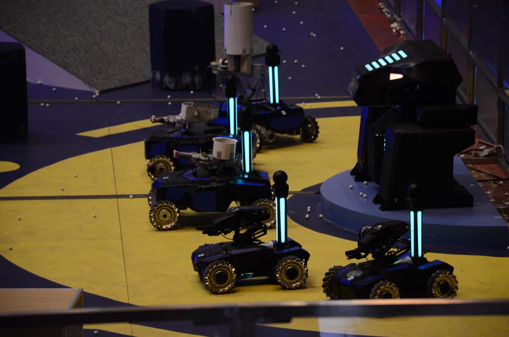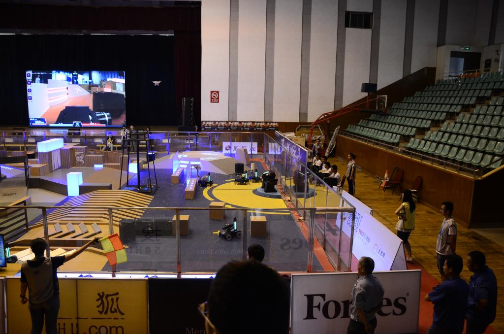 競賽隊伍分為紅、藍(lán)兩方,雙方均有6個機器人組成各自戰(zhàn)隊,包括1個炮手(裝備大口徑彈丸負(fù)責(zé)重型打擊),2個射手(負(fù)責(zé)機動打擊),2個騎兵(負(fù)責(zé)偵查和輕型打擊),1個哨兵(負(fù)責(zé)觀察敵情)。參賽隊員們通過高清視頻遠(yuǎn)程遙控,操控機器人戰(zhàn)隊在一個設(shè)計制作了瞭望塔、戰(zhàn)壕、橋梁、洞穴和樓宇的模擬作戰(zhàn)場地中,完成機動行走、跨越障礙、埋伏狙擊等復(fù)雜動作,并要在行動中使用機炮實施打擊,降低對手“生命值”(機器人身后附帶的可視血條裝置),成功攻占其基地的一方勝出。同時還要完成自身的子彈補給、“生命值”補充等任務(wù)。