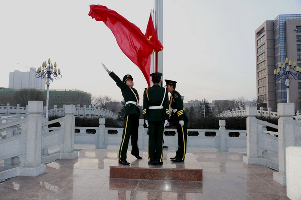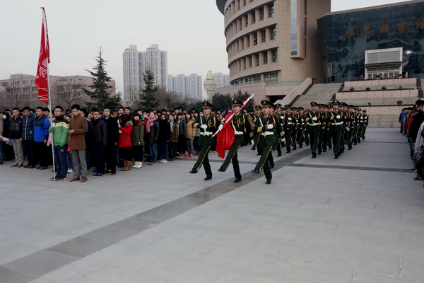 清晨,雖然已是數(shù)九寒天,但圖書館南廣場上已經(jīng)聚集了數(shù)千名前來觀禮的師生。7點(diǎn)50分,校國旗護(hù)衛(wèi)隊(duì)的隊(duì)員們在做最后的著裝整理,雖然已經(jīng)執(zhí)行過幾十次升旗儀式,但在這個(gè)特殊的日子,他們還是感到格外緊張。7點(diǎn)55分,50名身穿禮服的國旗護(hù)衛(wèi)隊(duì)員邁著矯健的步伐走向旗臺。8點(diǎn)整,伴隨著雄壯的國歌聲和一聲“敬禮”,國旗在半空中劃出了一道美麗的弧線。在場的每一個(gè)人臉上都露出了激動的神情。