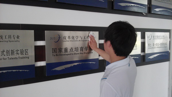 義工崗學(xué)生正在學(xué)院擦拭銘牌