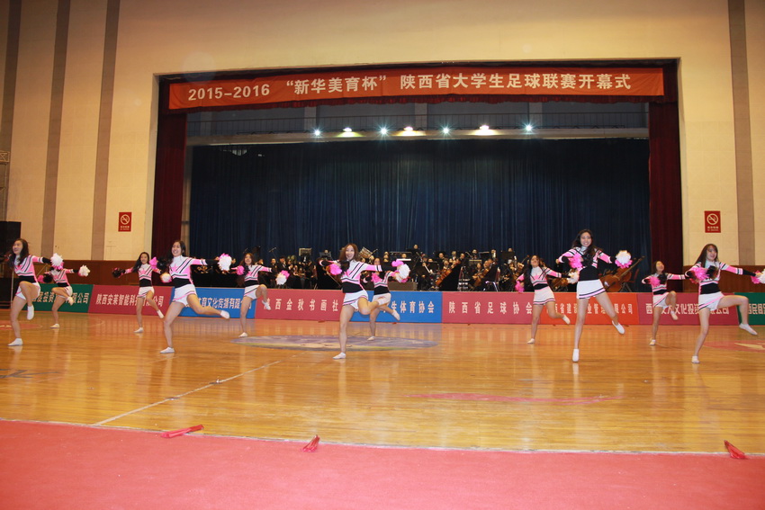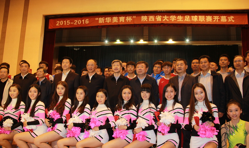 10月22日,2015-2016“新華美育杯”陜西省大學(xué)生足球賽在西安交通大學(xué)拉開帷幕。在開幕式中,我校啦啦操隊表演了蘊含民族特色和大學(xué)生激情活力的啦啦操,受到了與會的國家體育總局局長劉鵬、陜西省副省長莊長興、陜西省教育廳廳長李興旺等領(lǐng)導(dǎo)的一致好評。開幕式后,與會領(lǐng)導(dǎo)與啦啦操隊員們親切合影。