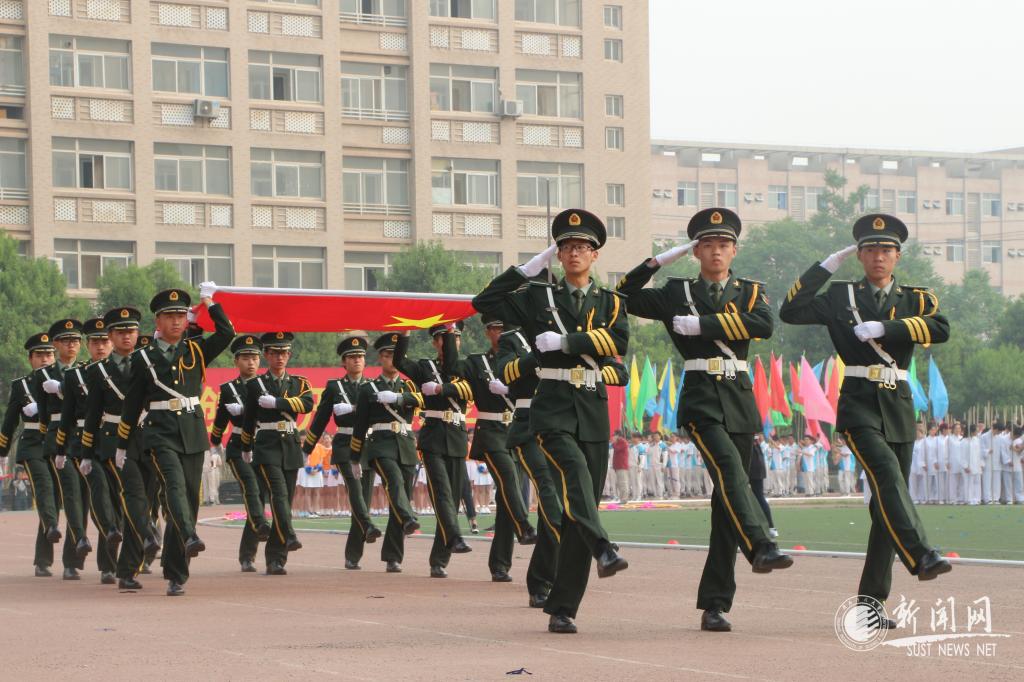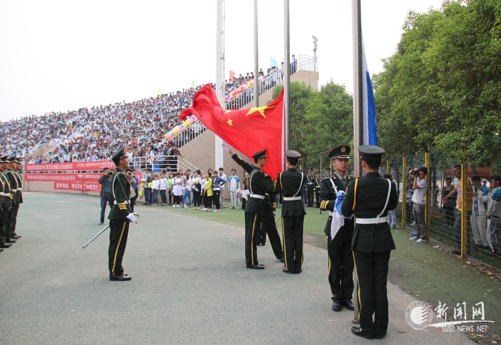 隨后,與會師生全體起立,舉行了莊嚴(yán)的升國旗、校旗和運動會會旗儀式。