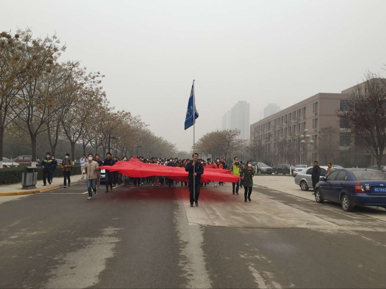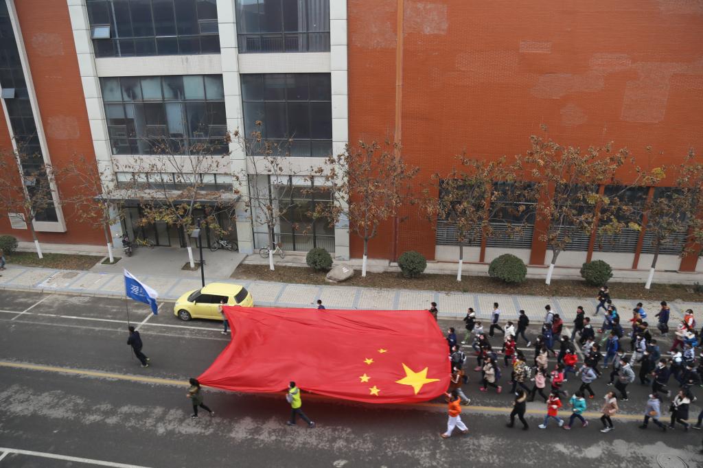 愛(ài)國(guó)長(zhǎng)跑活動(dòng)在鮮艷、巨大的國(guó)旗和高高樹(shù)立的院旗下隆重舉行,莊嚴(yán)的愛(ài)國(guó)演講打開(kāi)了同學(xué)們心中的愛(ài)國(guó)之門(mén)。80年前的今天,一九三五年,一群愛(ài)國(guó)青年在黨的領(lǐng)導(dǎo)下,走上街頭,高呼“反對(duì)華北自治”、“停止內(nèi)戰(zhàn),一致抗日”等愛(ài)國(guó)口號(hào),為國(guó)共合作打下基礎(chǔ);80年后的今天,二零一五年,一群科大學(xué)子在國(guó)旗的帶領(lǐng)下,胸帶徽章,手舉國(guó)旗,奔跑在科大校園中,立志為實(shí)現(xiàn)中華民族偉大復(fù)興的“中國(guó)夢(mèng)”而努力奮斗。