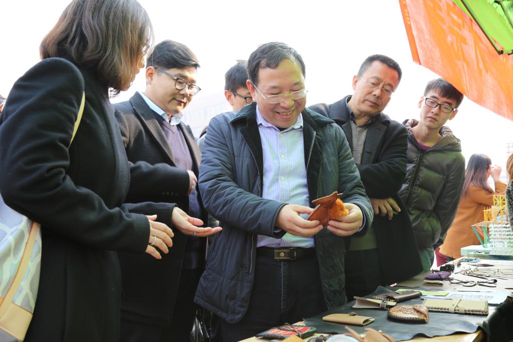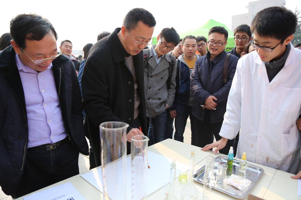 隔音型環(huán)保氣壓熱敷音樂(lè)眼罩、健身發(fā)電系統(tǒng)、紅棗打漿去核機(jī)、懶人克星時(shí)鐘、智能預(yù)警小車(chē)、空氣路由器……200余件科大學(xué)子的最新科技創(chuàng)新成果,12月7日齊刷刷亮相我校2015年大學(xué)生科技創(chuàng)新節(jié)暨大學(xué)生科技創(chuàng)新成果展開(kāi)幕式。這些集體驗(yàn)性、科學(xué)性、趣味性為一體的科技創(chuàng)新作品,吸引了萬(wàn)余名師生駐足參觀,在全校掀起了大學(xué)生參與科技創(chuàng)新的又一熱潮。校長(zhǎng)姚書(shū)志、校黨委副書(shū)記溫鋒親臨開(kāi)幕式現(xiàn)場(chǎng)參觀指導(dǎo)。校長(zhǎng)姚書(shū)志(左三)饒有興致地參觀了解科技創(chuàng)新作品的外觀、原理功能、實(shí)際應(yīng)用等方面校黨委副書(shū)記溫鋒(左二)在利用變色反應(yīng)原理的紙上題書(shū)“創(chuàng)新”兩字寄語(yǔ)莘莘科大學(xué)子