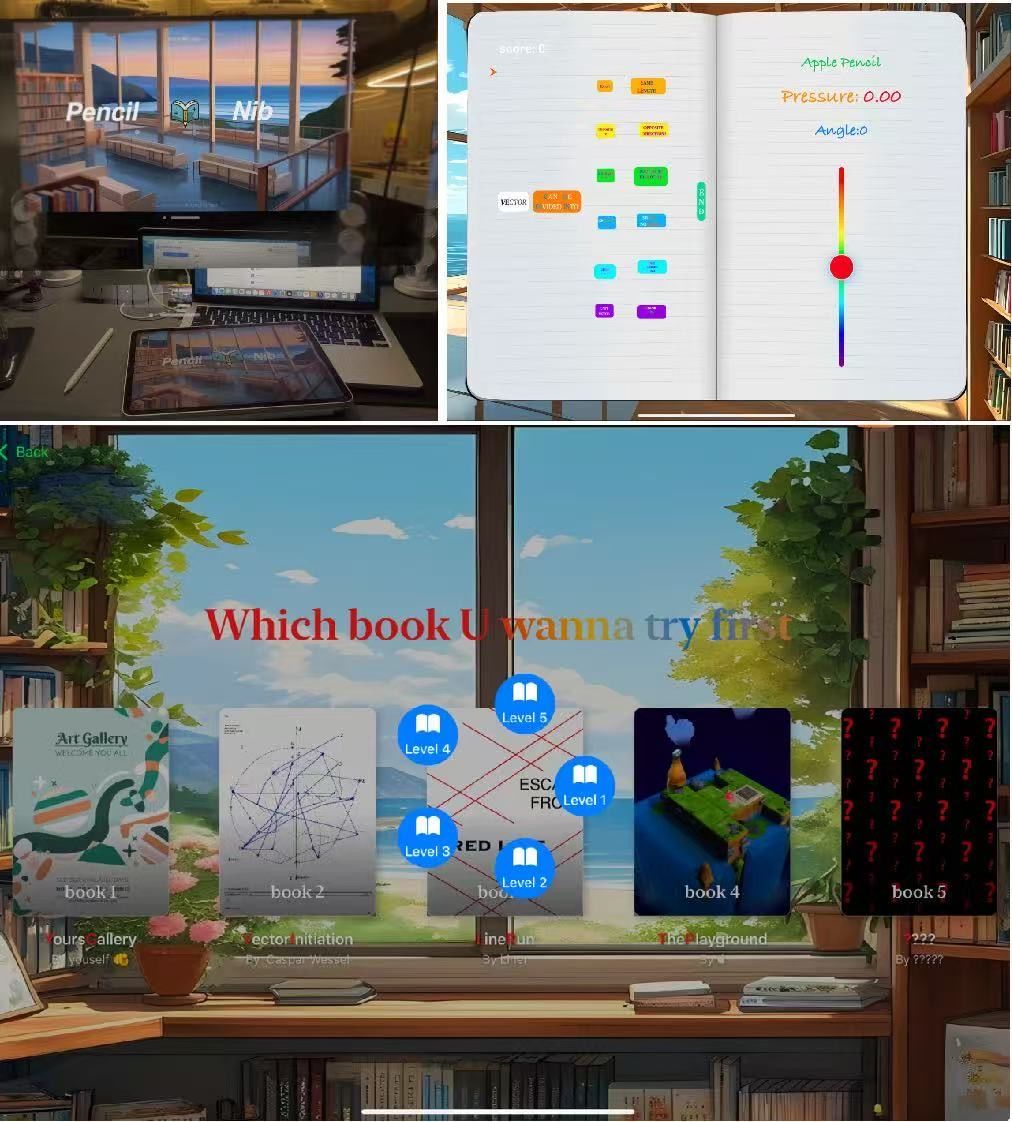 陸星宇此次作品 “Pencil nib”屬于一款壓感游戲,能夠幫助注意缺陷與多動障礙(ADHD)患者集中注意力。ADHD是一種以注意力無法持久集中、過度活躍和情緒易沖動為主癥的神經(jīng)發(fā)育障礙,常在兒童時期發(fā)病,多數(shù)在學(xué)齡前期開始出現(xiàn),主要分為兒童青少年ADHD和成人ADHD兩種類型。探索Apple pencil作為多元場景游戲手柄的潛力,讓玩家通過控制“ mini Pen ”來修復(fù)書本。運用 SwiftUI 的 TabView 框架搭建了引導(dǎo)幻燈片,讓玩家快速掌握基礎(chǔ)操作;后半部分采用四格漫畫劇情,通過 Procreate、GoodNotes、醒圖以及 iPad OS 18 鎖屏繪制完成,增強玩家游玩興趣。第一本為空白繪本,基于SpriteKit設(shè)定主角物理屬性,UIKit構(gòu)建自適應(yīng)框架確保界面成比例,能讓玩家發(fā)揮想象力自由繪畫。第二本為向量知識,通過SpriteKit定義節(jié)點與箭頭碰撞檢測,觸發(fā)SwiftUI層來調(diào)用Apple Pencil震動反饋。第三本為逃離紅線關(guān)卡,SpriteKit控制七個方向隨機生成的箭頭與紅線物理交互,使用SF Symbols素材做為出口,成功逃脫即通關(guān)。第四本為The Playground,采用一種MIT協(xié)議開源迷宮算法,SpriteKit實現(xiàn)Byte角色與寶石碰撞檢測,迷宮中心寶石獲取后通關(guān)。