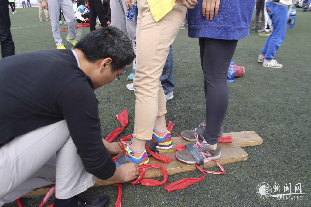 教工中年組女子和男子三人踏板競(jìng)速分別與9:20和9:50進(jìn)行。在開(kāi)賽環(huán)節(jié),許多老師都來(lái)給要比賽的老師幫忙——用紅布系腳,粘膠帶,滿滿的關(guān)懷。在這里,競(jìng)技精神得到了充分的體現(xiàn),在這里,三人成行,一起奔向終點(diǎn)。