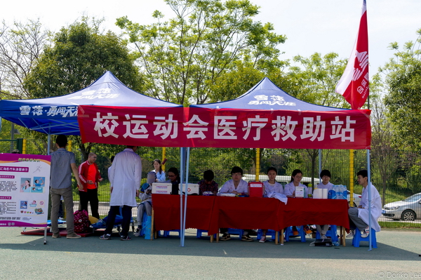 處理完這些之后,幾名醫(yī)護(hù)人員又趕回了熱鬧的運(yùn)動場,這里有一個藍(lán)色的帳篷,里面配備有氧氣袋、擔(dān)架和醫(yī)療救助箱等救援器材,隨時準(zhǔn)備救助賽場上受傷的運(yùn)動員和觀眾。這是由校醫(yī)院和匯?;饡?lián)合成立的一支醫(yī)療救助隊,除了一名醫(yī)生和一名護(hù)士,其余的15個人都是匯?;饡拇髮W(xué)生志愿者。從去年開始,他們就成為運(yùn)動會的駐場組織,還會不定期派人在賽場上巡邏,以便及時為師生們提供醫(yī)療救助服務(wù)。