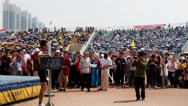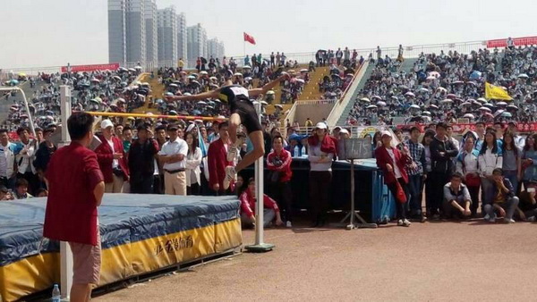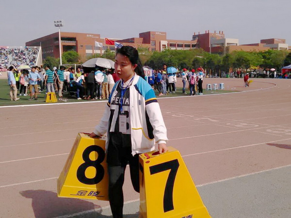 在現(xiàn)場觀眾的熱烈掌聲中,“新科狀元”陳賢星與寫有“1.84”數(shù)字的黑色記錄牌“甜蜜”地合影,讓鏡頭定格在這一輝煌的時刻。這位看起來瘦削的輕工學(xué)院包裝141班的男生,身高193cm,曾在高中時就獲得過重慶市男子跳高比賽的冠軍。同樣的,他對三級跳遠(yuǎn)也頗感興趣,在本屆運動會男子三級跳遠(yuǎn)決賽中,又以13.45米的成績再次打破校運會記錄。